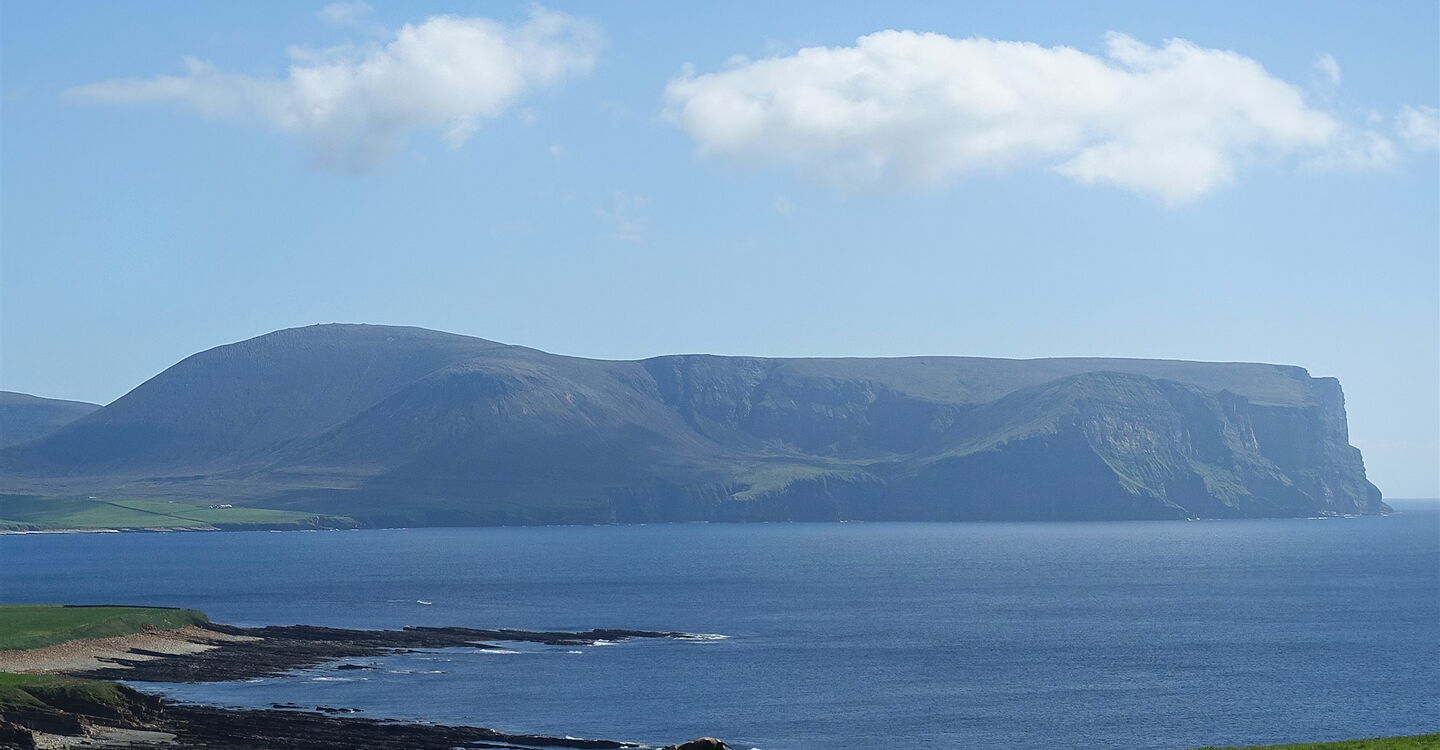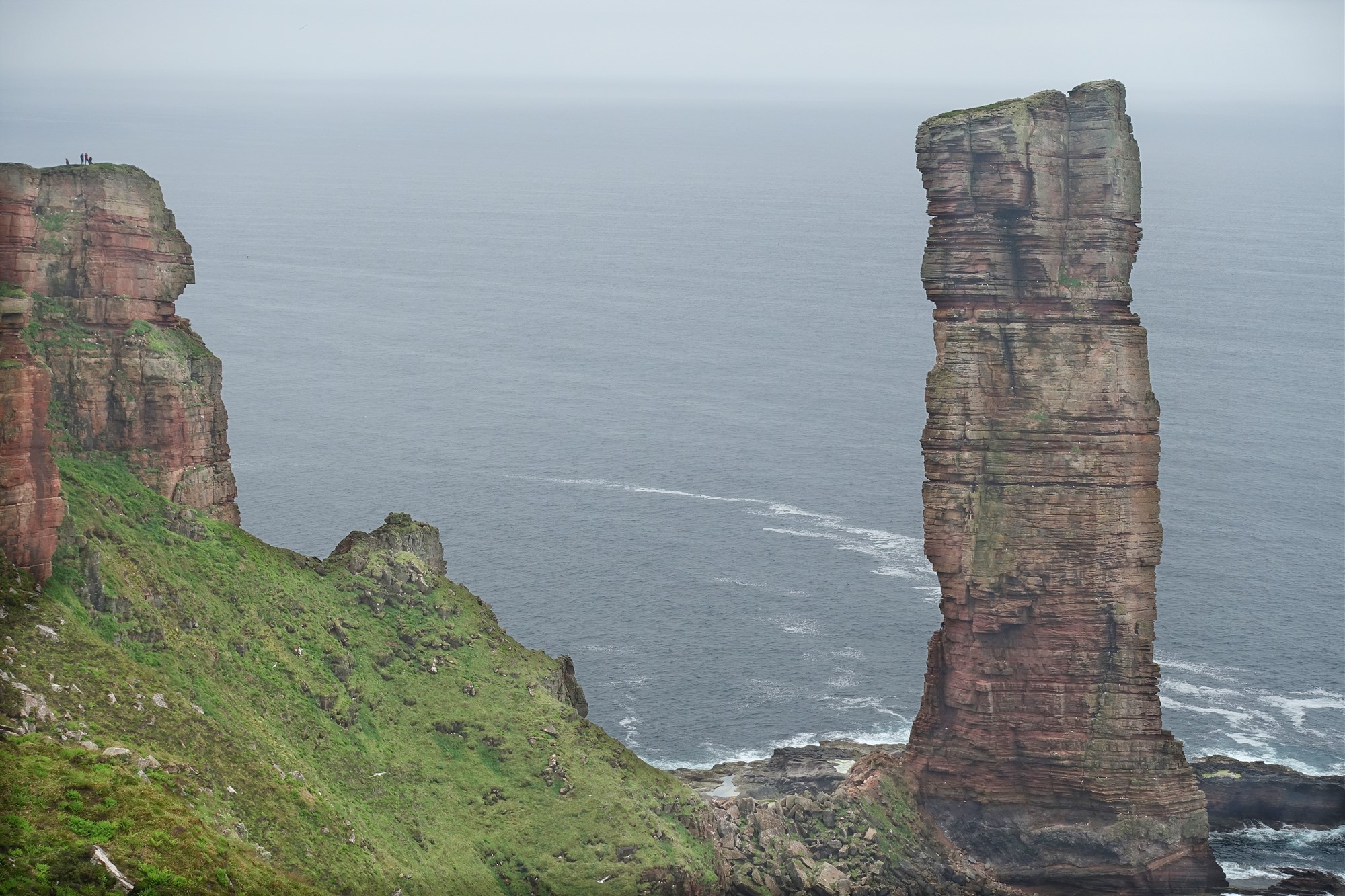 Wir erreichen einen Betonsockel. Ab diesem Messpunkt ist wieder ein schmaler Trampelpfad auszumachen. Bei aufgestellten Steinplatten beginnen wir nun halb rechts mit dem Abstieg über die Almwiesen Schottlands. Wir erreichen den oberen Klippenrand, beim Blick auf das 332 m tiefer gelegene Meer stockt automatisch der Atem. Vor uns thront das 03 St John's Head (332 m), mit 343 m ist es die am steilsten abfallende Klippe Großbritanniens. 1970 wurde sie erstmals bestiegen. Von nun an folgen wir dem Küstenpfad bis zur Laeden Geo. Eine an ihrer engsten Stelle 3–5 m breite Rinne fällt aus 328 m Höhe steil bis zum Meer ab, mittig hat sich dekorativ ein großer Stein verkeilt.