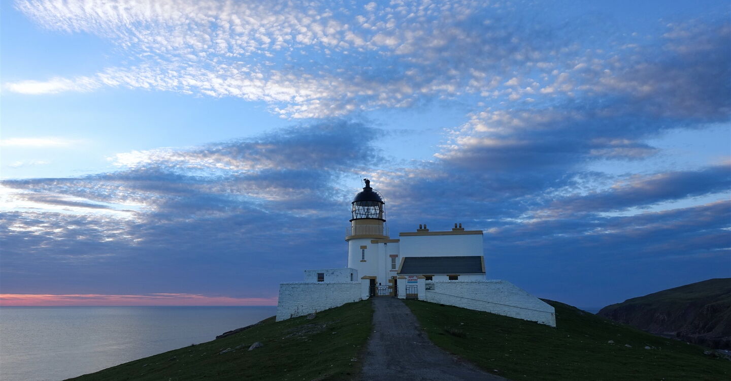 Vom 01 Start und Ziel (33 m) an dem kleinen Parkplatz unterhalb des Leuchtturms von Stoer folgen wir dem grasbewachsenen Pfad mit dem Wegweiser aus Holz – "Old Man of Stoer, 3 km". Achtung: Nicht in die Schotterpiste gehen, auf dieser kehren wir von der Wanderung zurück! Der Pfad ist breit, aber schwach ausgeprägt und oft ziemlich nass. Parallel zur Küste verläuft er leicht bergauf, es ergeben sich großartige Ausblicke auf den hinter uns liegenden Leuchtturm. Wir wandern auf einem Küstenpfad oberhalb der Klippen, unerreichbare Buchten liegen 60–80 m tiefer. Ein kleiner Bachlauf hat eine Schlucht in die Klippen gefräst, diese queren wir auf einem mit Steinen verlegten Pfad.