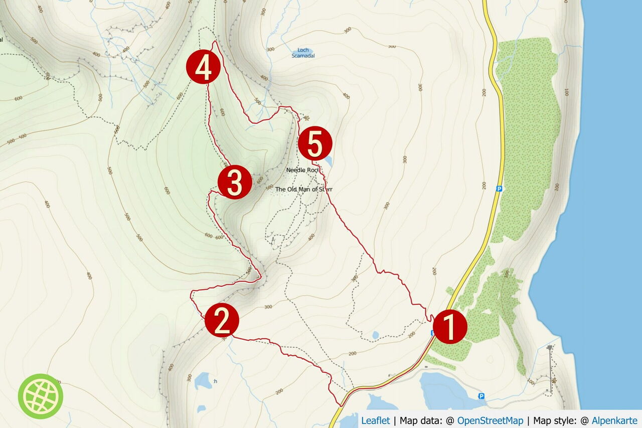 Pkw-Anfahrt: Der Start befindet sich auf der Insel Skye, der größten Insel der Inneren Hebriden, unmittelbar vor der Westküste des schottischen Festlands im Atlantik. Von Portree auf Skye geht es auf der A855 Richtung Staffin. Nach 11 km gibt es Parkplätze links und rechts der Straße. GPS-Koordinaten: 57.497927 -6.158724. Busservice: Beispielsweise fährt die Buslinie 57A um 8:35 von Portree, Somerled Square nach Torvaig, Old Man of Storr Car Park; Ankunft 8:55. Bitte informieren Sie sich vor Antritt der Wanderung über die aktuellen Zeiten auf der Webseite: https://www.stagecoachbus.com/plan-a-journey.