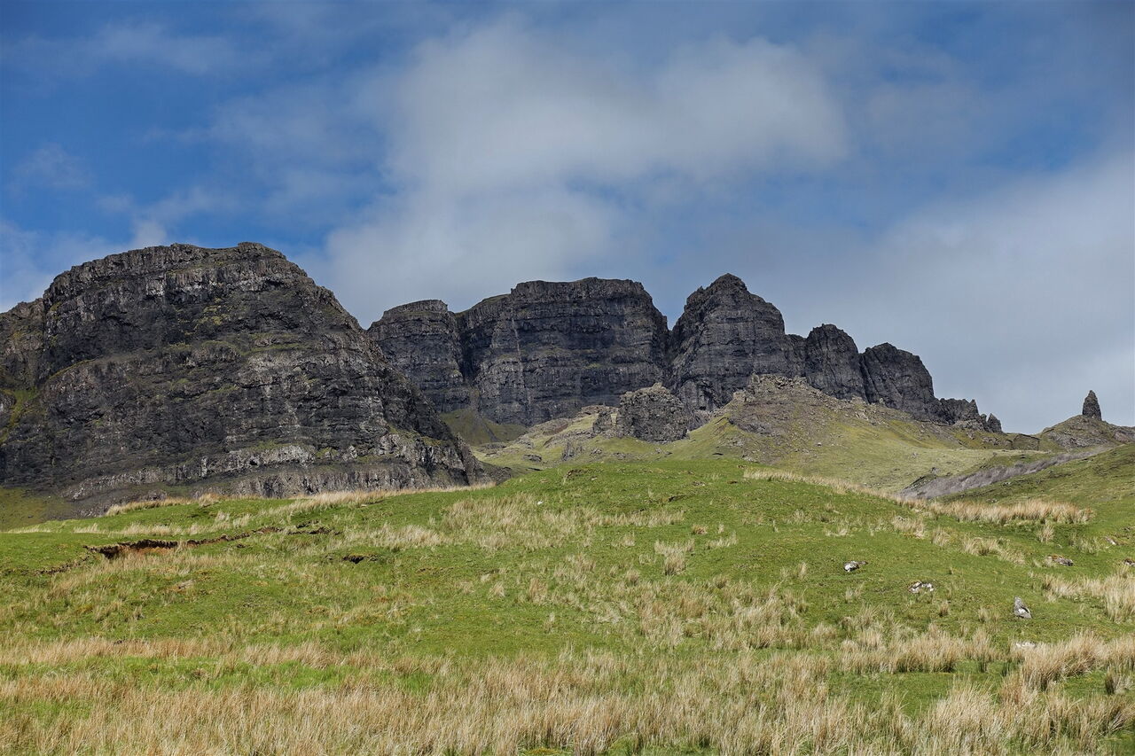 Dieser führt nun spektakulär entlang der Abbruchkante des mächtigen Erdrutschs vor 15.000 Jahren und gewährt faszinierende Tiefblicke auf den Old Man of Storr und seine Kinder. Während sich unterhalb an schönen Tagen die Touristenscharen drängen, steigen wir im Alleingang auf Grashängen bis zum Gipfel des 03 The Storr (719 m) auf. Während die felsige Ostseite des Gipfels gut 300 Höhenmeter senkrecht abfällt, sind das Gipfelplateau sowie seine Ostseite dagegen unspektakulär, leicht abfallend und mit Gras bewachsen. Ja, das Grün ist so kurz gehalten, dass man es als "Englischen Rasen" bezeichnen könnte, wären wir nicht in Schottland.