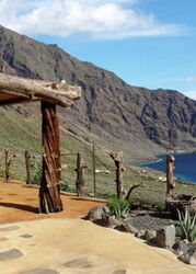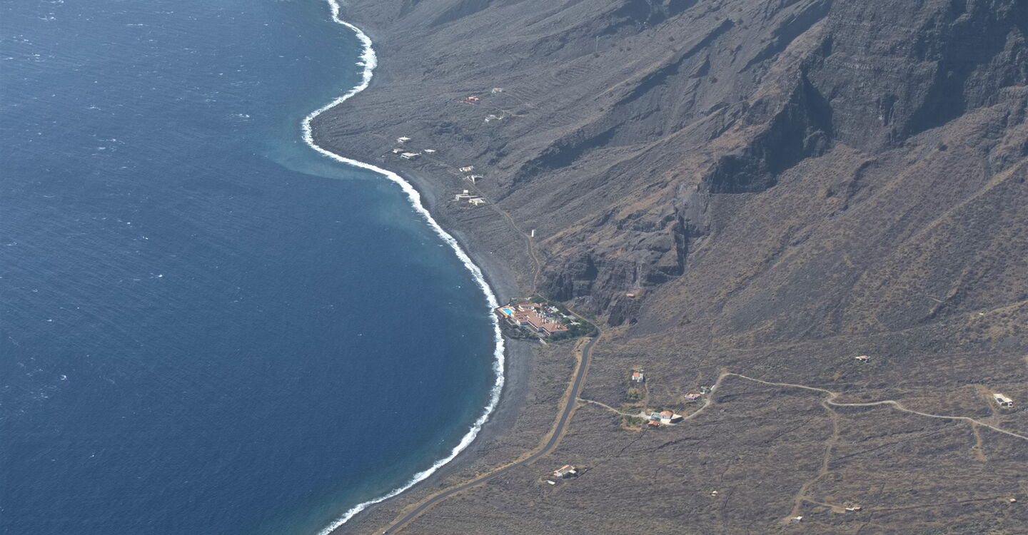 Wieder auf einer Asphaltstraße gehen wir nur einige Meter rechts bis zum (05) Mirador de Isora (831 m), es eröffnet sich ein spektakulärer Tiefblick auf die Bucht. Es folgt ein gerölliger Abstieg durch den extrem steilen Berghang. Dabei sollte man Folgendes bedenken: Der Abstieg von Mirador de Isora nach Las Playas wurde angelegt, um die Wandertierhaltung zwischen Berg und Tal zu gewährleisten. Außerdem wurde die Route genutzt, um sich in der Trockenzeit an der Quelle von Las Playas mit Trinkwasser zu versorgen oder um zum Fischen an die Küste zu gelangen. Eigentlich kann man sich beim Abstieg nicht verlaufen, aber trotzdem gibt es eine Schlüsselstelle. Nachdem wir den Bergrücken hinter uns gelassen und ein Trockenbachbett erreicht haben, folgen wir nicht dem Verlauf, sondern queren dieses und steigen noch einmal zu einer Anhöhe auf. Von dort führt der Camino bis zu der Streusiedlung Las Playas. Im weiteren Verlauf gelangen wir bis zur Hauptstraße, die direkt zum Hotel Parador führt.