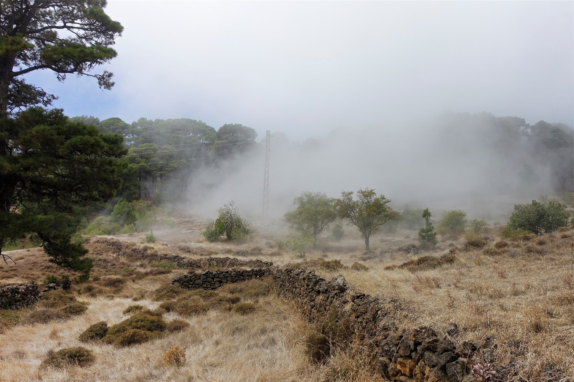 Hier folgen wir rechts der Ausschilderung Richtung Las Playa, bis wir auf die querende Straße zum (03) Mirador de Las Playas (1066 m) treffen – einer der beeindruckendsten Miradors auf El Hierro. Nach der Besichtigung gehen wir ein kurzes Stück auf dem Hinweg zurück. An der Stelle, wo wir auf die Straße getroffen sind, gehen wir rechts auf dem Pfad weiter. Der folgende Wegabschnitt führt immer am Abgrund entlang. 1100 m über dem Meeresspiegel ergeben sich immer wieder gigantische Tiefblicke – wenn nicht Passatwolken die Sicht vernebeln. Der Pfad geht in eine Schotterpiste über und mündet nur kurz später in eine Asphaltstraße, auf der wir Richtung Isora bergab wandern.