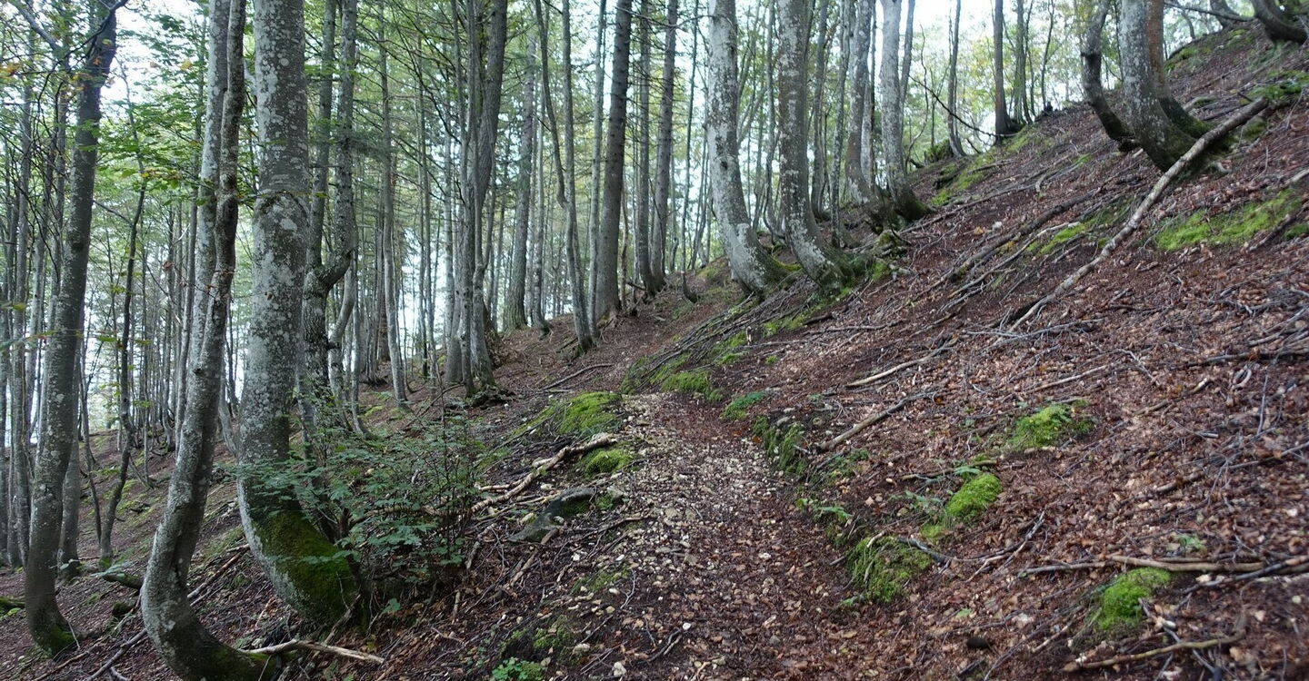 Wir ignorieren den abzweigenden Wanderweg 729. An der nachfolgenden Straßengabelung nehmen wir den halb links bergab führenden Arm und lassen den rechten 02 Abzweiger (1.412 m) zur Malga Fossetta aus. Einen weiteren rechten Abzweiger zu einem Haus lassen wir ebenfalls liegen und gehen geradeaus weiter, hier ist der Weg auch ausgeschildert Richtung Bivacco Feltre. Bei der darauffolgenden Holzhütte gehen wir nicht links, sondern geradeaus weiter, nun auf einem schmalen Pfad. Nach kurzem Abstieg endet der Pfad und wir gehen rechts auf einer Piste weiter.