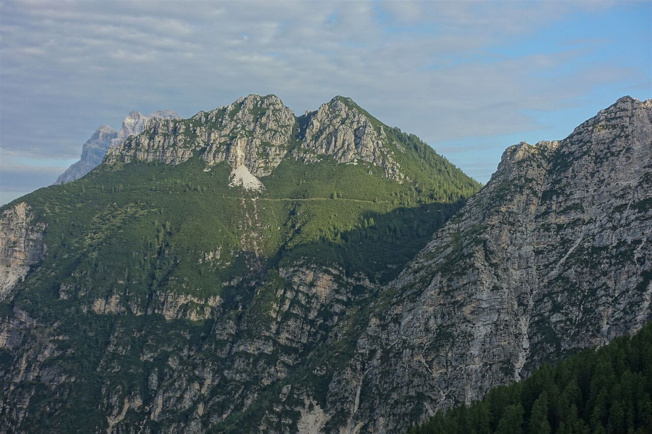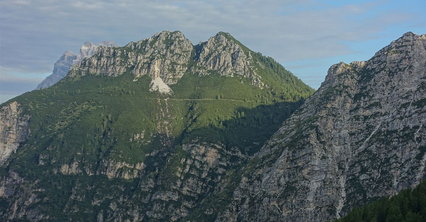 Diese Tour beschreibt den 1. Wegabschnitt der spektakulären Querung der Bosconerogruppe, die noch weitgehend unbekannt und kaum erschlossen ist. Auf dieser sehr naturnahen Wanderung erblicken wir vor der Einsattelung Le Calades die schroffen Felsgipfel des 2.413 m hohen Sassolungo di Cibiana und des 2.425 m hohen Sfornioi. Sobald wir die Einsattelung Le Calades überschritten haben, ergibt sich eine fantastische Sicht auf den 2.430 m hohen Sasso di Toanella, den 2.412 m hohen Rocchetta Alta und den 2.469 m hohen Sasso di Bosconero. Bei dieser einmaligen Naturlandschaft ist das Wandern ein Vergnügen der Extraklasse.