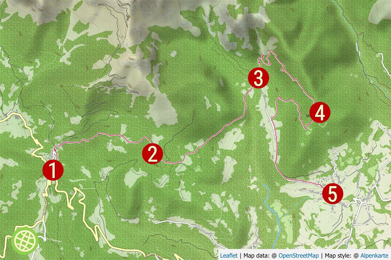 Auf dem in südwestliche Richtung (rechts) bergab führenden Pfad verlassen wir den Gipfelbereich. Bei der ersten Gabelung entscheiden wir uns für den halb rechts abzweigenden Pfad, der an einer Piste endet. Dieser Piste folgen wir rechts entlang bis zur Straße, wo wir links an schönen Bauernhäusern und einer Kapelle vorbeikommen. Im Dorf Lamen gehen wir noch an der Kirche vorbei und erreichen dann die 05 Bushaltestelle Lamen (532 m).