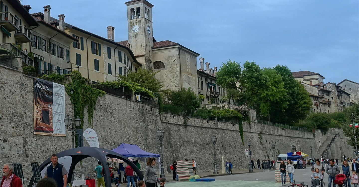 Auf dem Fußweg entlang der Hauptverkehrsstraße – die Zivilisation hat uns spätestens hier wieder eingeholt – gehen wir nun Richtung Ortszentrum. Weitere schöne Villen befinden sich rechts und links der Straße. An einer Kirche gabelt sich die Straße, wir gehen geradeaus auf der Viala Farra weiter. Hinter der ehemaligen Kaserne gehen wir direkt in die Einbahnstraße. Nachdem wir den Bachlauf überquert haben, spazieren wir unterhalb der Stadtmauern halb rechts durch eine Einkaufsstraße. Bei einer weiteren Straßengabelung blickt man halb links entlang der Stadtmauer aus dem 16. Jahrhundert bis zu der 04 Chiesa di San Giacomo Feltre (237 m).