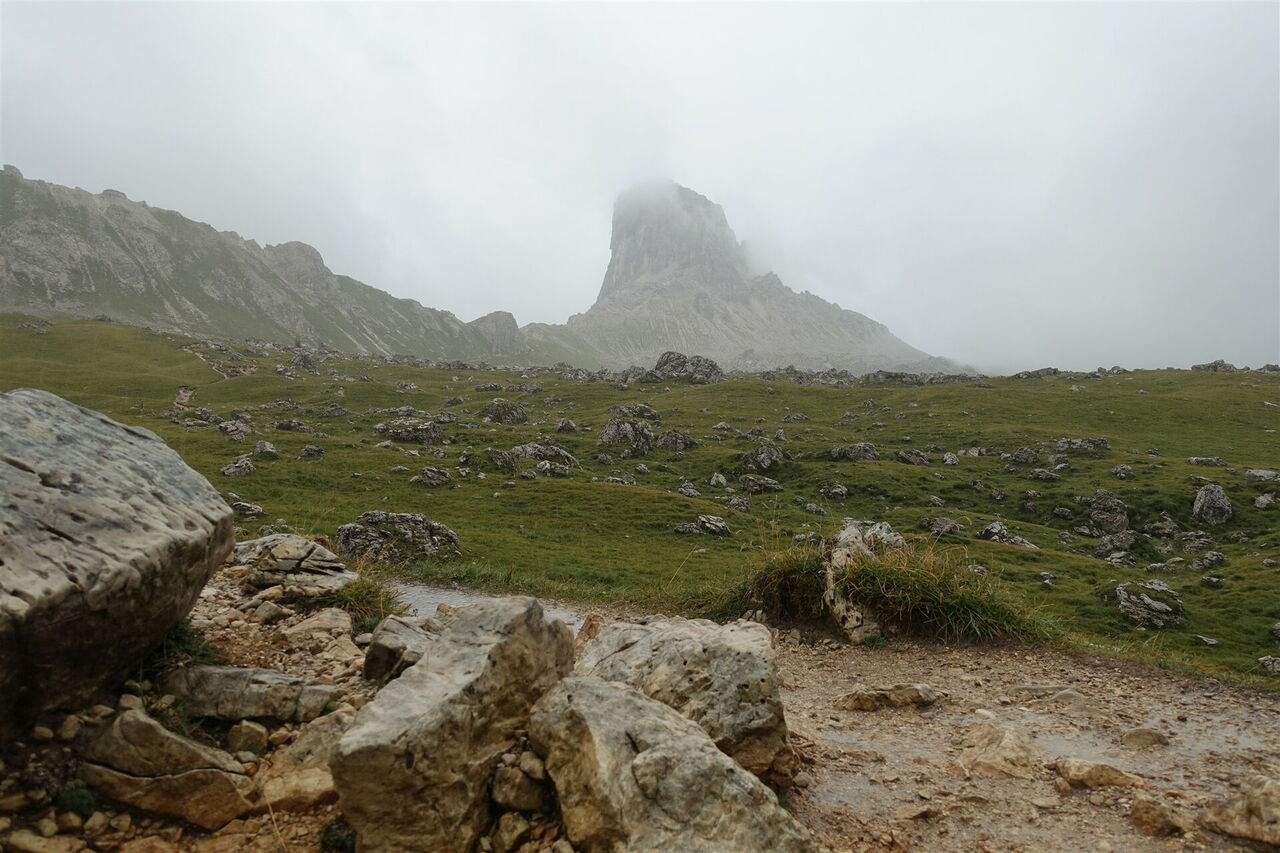 Links führt der Wanderweg 436 bergab zur Malga Giau. Wir gehen nun rechts – ebenfalls der Wanderweg 436 – und erreichen nach steilem Aufstieg die aussichtsreiche 02 Forcella di Giau (2.370 m). Von hier, am Fuße der steilen Südwände des 2.657 m hohen Ponta Lastoi de Formin, schweift unser Blick Richtung Südosten bis zu den mächtigen Felswänden des Monte Pelmo. An der Gabelung mehrerer Pfade gehen wir in östlicher Richtung weiter auf dem Wanderweg 436 Richtung Forcella Ambrizzola. Zunächst navigieren wir im Slalom um riesige Felsen, bis der Weg durch flaches Wiesengelände dann leicht bergab führt. Da der Weg bei Nebel keine Orientierungspunkte bietet, wurden bemalte Holzpflöcke sporadisch aufgestellt. Bei guter Sicht ist die Orientierung kein Problem, denn wir gehen auf die westliche Flanke des mächtigen Felsturms des Becco di Mezzodì zu.