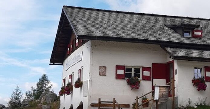 Unterhalb der Westhänge des Berges Col de la Puina wandern wir durch lichten Wald auf der Forststraße leicht bergab. Sobald wir unterhalb der Forststraße das 05 Rifugio Città di Fiume (1.918 m) sehen, steigen wir auf dem nachfolgenden Pfad zum Haus ab. Von der Hütte blickt man direkt auf die mächtigen Schutthalden der Nordwestflanke des 3.127 m hohen Monte Pelmo.