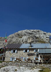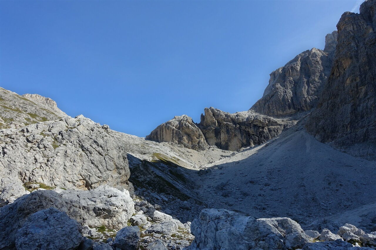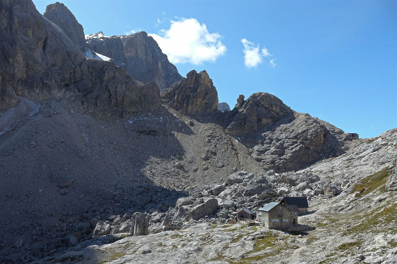 Unter den mächtigen Gipfeln der Pale di San Martino steigen wir dann durch ein breites Tal zum 2.619 m hohen Passo Mulaz auf. Bei guter Sicht kann man bereits unterhalb das 05 Rifugio Mulaz (2.571 m) erkennen, das nach wenigen Metern Abstieg erreicht ist.