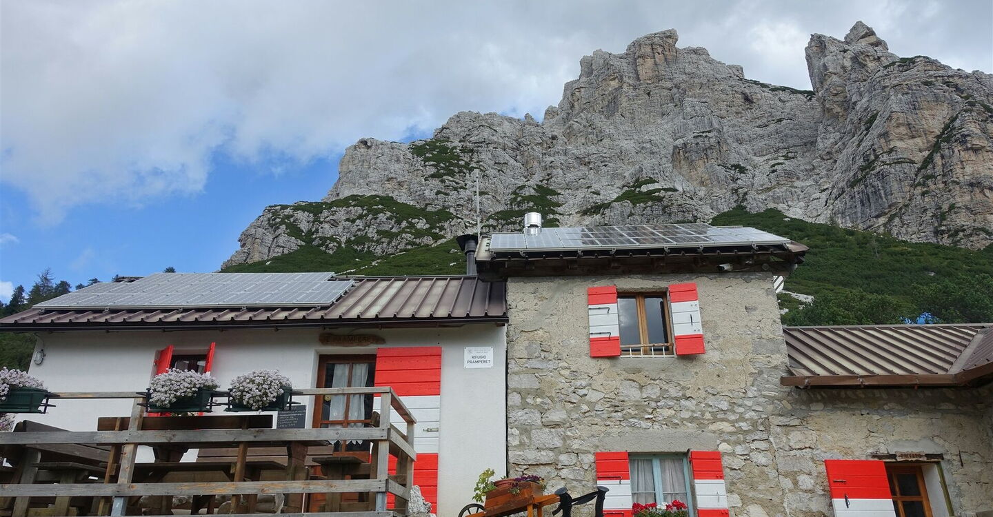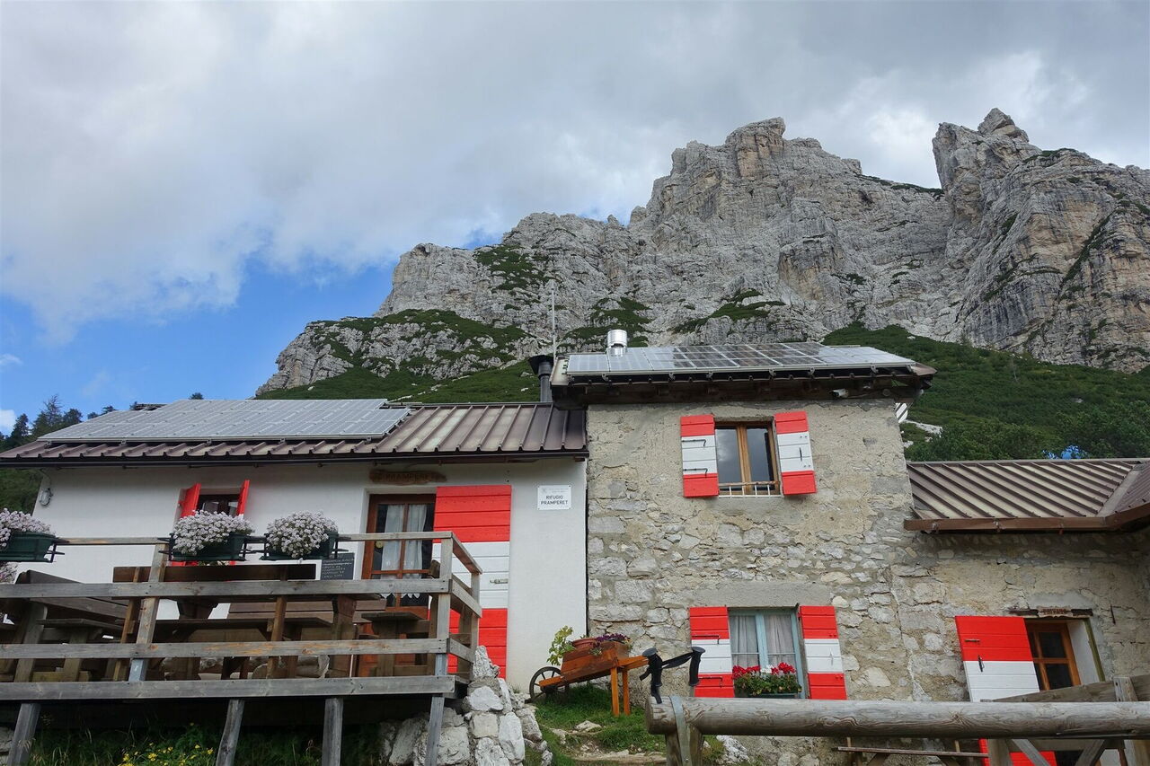 Wir treffen auf die Ruinen des 1913 fertiggestellten Forte di Moschesin, erbaut zum Schutz des Heimatlandes vor Invasionen. Es lag auf der sogenannten gelben Linie (Linea Gialla). Aber bereits 1917, nach der Schlacht von Caporetto, verschoben sich die Grenzlinien und die Stellung wurde nutzlos. Der Wanderweg gabelt sich an dieser Einsattelung (Forcella). Weiter geradeaus führt der Wanderweg 543, wir folgen jedoch der halb rechts und leicht bergauf führenden Variante Panoramica. Sowohl die Hauptroute als auch die Variante sind zielführend. Schon nach einem kurzen Aufstieg haben wir dann freien Blick auf den Monte Pelmo (Nordwest 330°) und Antelao (Nord 21°). Die beiden Varianten führen wieder zusammen und wir erreichen den querenden Wanderweg 514 (siehe Etappe 18). Wir gehen hier nun links bis in die Senke und dann halb rechts weiter bis zum 05 Rifugio Sommariva al Pramperet (1.857 m).