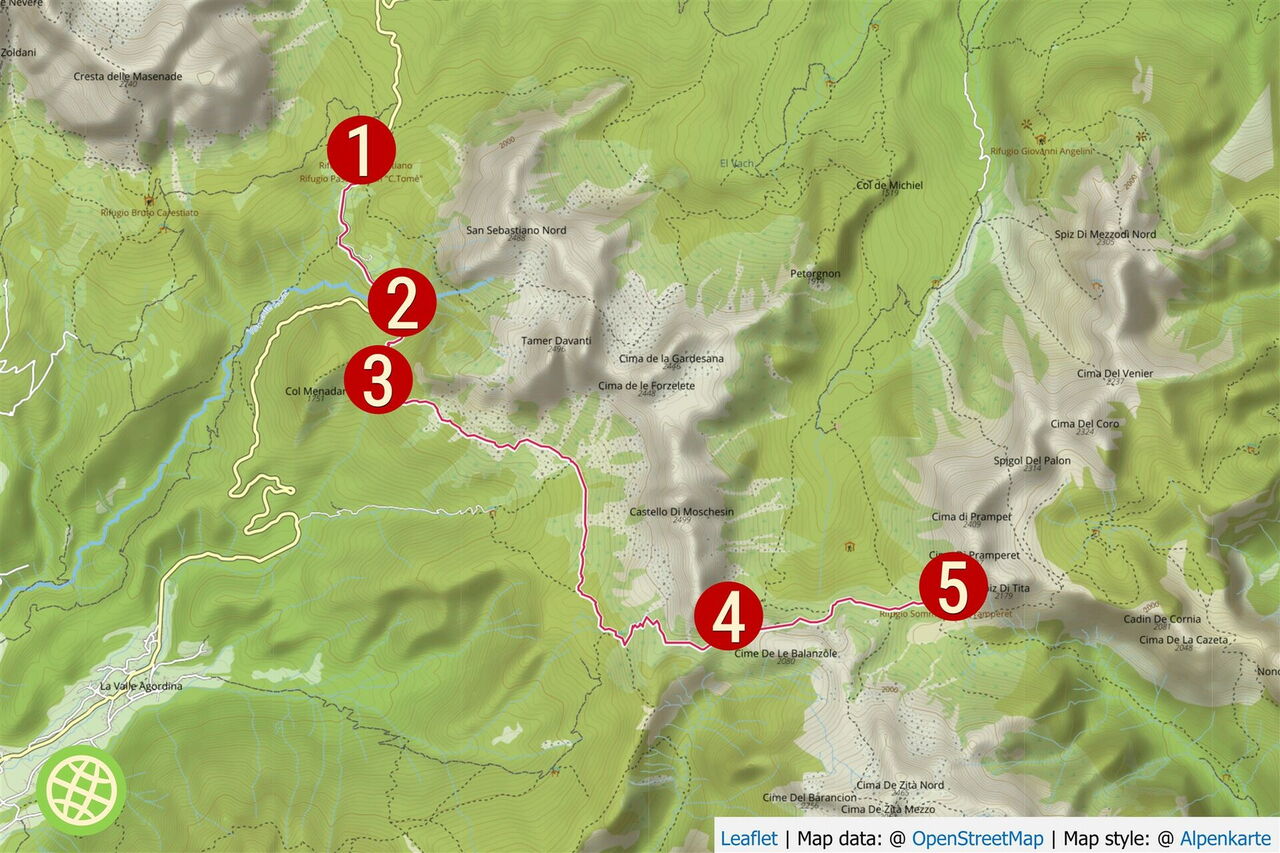 Startpunkt/Einstieg/Abbruch: Der Dolomitenpass Passo Duran ist zu Fuß, mit dem Pkw und mit dem Bus erreichbar und befindet sich am Ende der Tour 16. Endpunkt: Das Rifugio Sommariva al Pramperet ist nur zu Fuß erreichbar und befindet sich am Anfang der Tour 18.