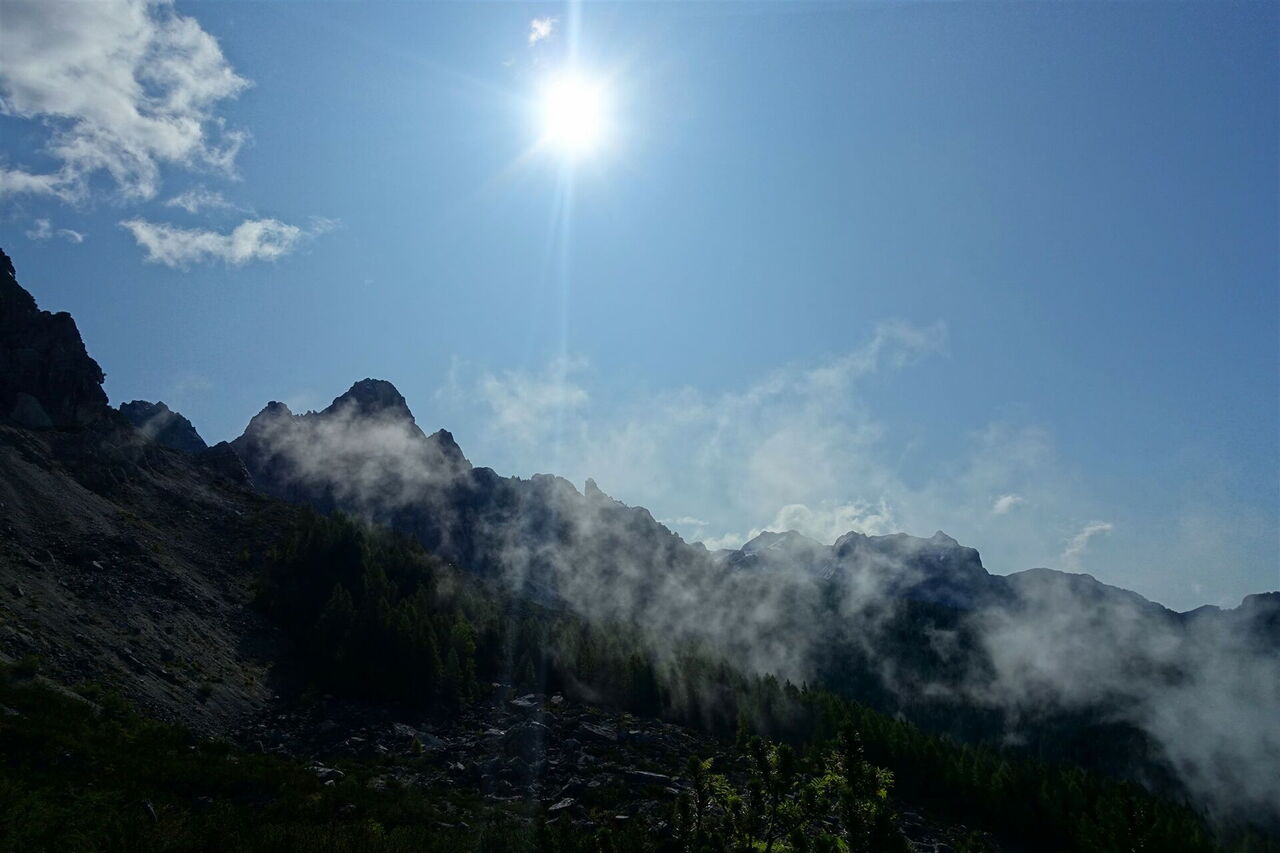 Zwischen Wiesen gelegen, erreichen wir dann die Casa del Moschesin (1.800 m) und einen Brunnen. Von dort gehen wir auf einem mit Latschenkiefern bewachsenen Berghang im Zickzack bergauf. Nach einem ca. 200 m langen und gerade verlaufenden Wegabschnitt erreichen wir den Scheitelpunkt (1.966 m) unserer heutigen Wanderung. Richtung Südosten ergibt sich ein wunderschöner Ausblick auf die drei Gipfel der Cima de Zità, die zur Talvenagruppe gehören. Nach kurzem Abstieg erreichen wir die 04 Forcella Moschesin (1.938 m).