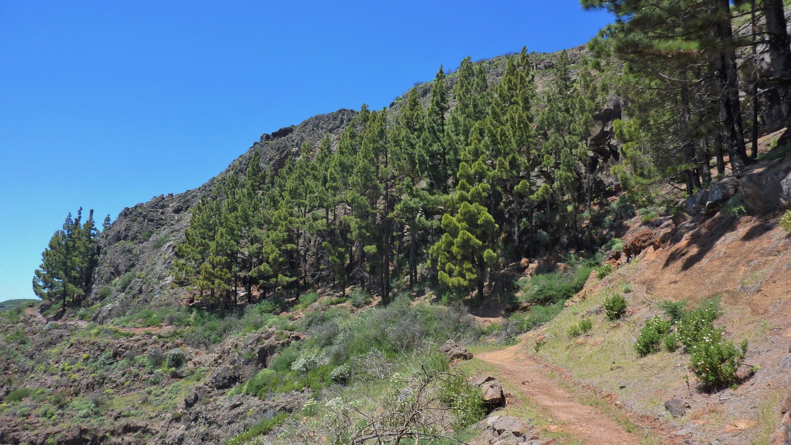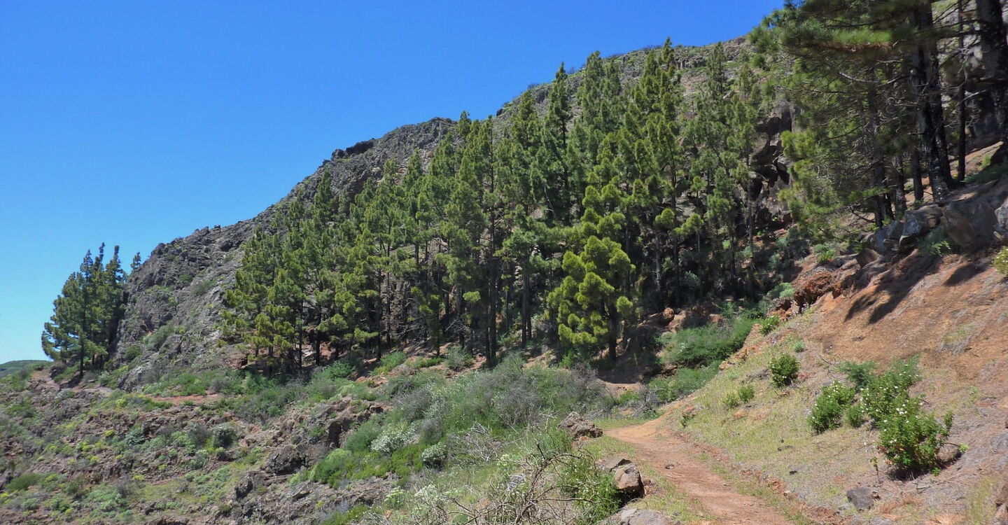 Der Wanderweg führt unterhalb von prachtvollen Kanarenkiefern bis zur (05) Asphaltstraße (1145 m), an der wir links bergauf gehen und diese in einer Rechtskehre nach links verlassen. Wir wandern nun direkt auf die Fortaleza de Chipude zu und treffen wieder auf den Hinweg.