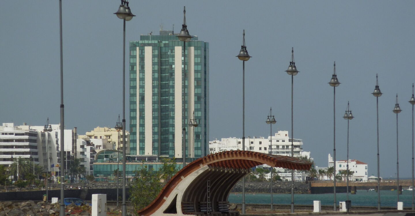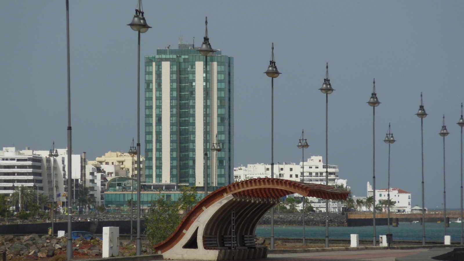 Wir nähern uns in großen Schritten unserem (05) Ziel (16 m). Das einzige Hochhaus der Insel, das Vier-Sterne-Hotel Gran Hotel Arrecife, ist nun zum Greifen nahe. César Manrique setzte seine ganze Kraft dafür ein, die karge und ursprüngliche Schönheit Lanzarotes zu bewahren. Eines seiner Ziele war der sanfte Tourismus ohne Bausünden wie Hochhäuser. Als jedoch César Manrique für einige Zeit in New York studierte, wurde 1960 heimlich und in aller Schnelle das luxuriöse Gran Hotel im Herzen von Arrecife erbaut. Tja - da stand es nun! Der weitere Weg führt vorbei am großen Marktplatz - Markt ist jeden Samstag von 9:00 bis 14:00 Uhr - bis zum grün bepflanzten Park Tematico de Arrecife mit seinen Skulpturen und einem Kinderspielplatz. In dem Dreieck zwischen dem Park, dem gelben Gebäude - dem Sitz der Inselregierung - und dem großen Kreisverkehr befindet sich der nicht zu übersehende zentrale Busbahnhof von Arrecife.