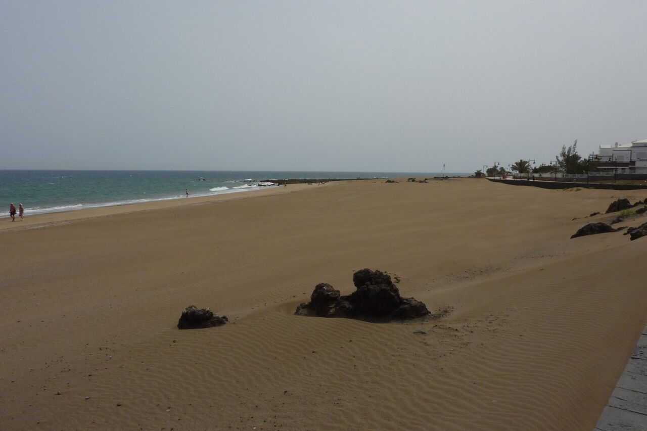 Der Promenadenweg geht nun direkt unter der Start- und Landebahn des (02) Flughafens (6 m) hindurch und im weiteren Verlauf parallel entlang des Abgrenzungszauns zum Gelände. Bedrohlich nah erscheinen hier die landenden Flugzeuge. 2015 konnte Lanzarote 6 Millionen Urlauber auf diesem Flughafen begrüßen. Der größte Anteil, ca. 60 %, sind Deutsche und Briten. Rechts von uns befindet sich nun der Playa Guacimeta. Früher war dieser ein Geheimtipp für FKK-Fans, aber seit dem Ausbau der Promenade ist es eine viel gelaufene Strecke. Nur bei Niedrigwasser ergibt sich ein schöner Strandabschnitt.