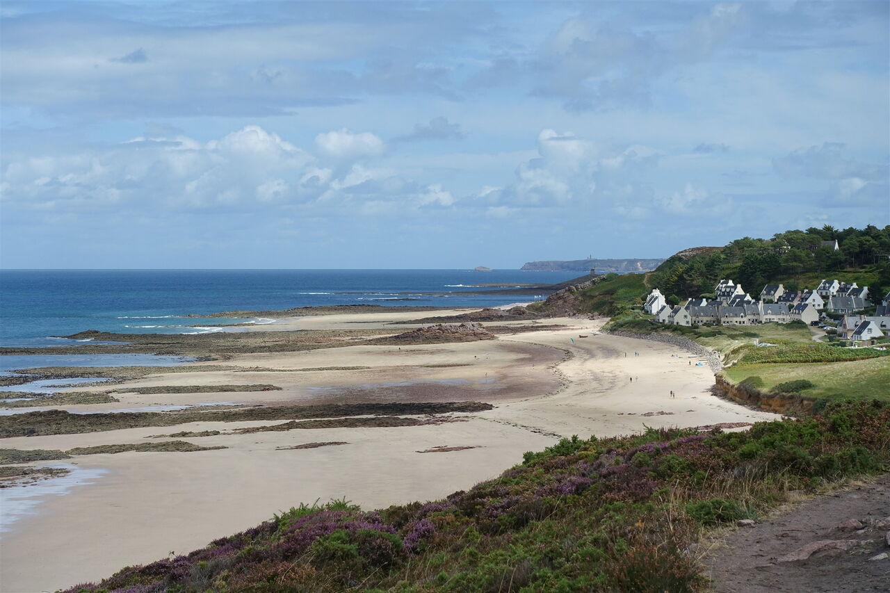 Nach kurzem Fußmarsch sehen wir unterhalb den bei Ebbe 900 m langen 03 Plage de Lourtuais (40 m) – ein wahrer Traumstrand, besonders schön ist er am westlichen Ende, wo ein kleines Kap Schutz vor dem Nordwestwind bietet. Wir gehen auf dem rechts bergab führenden Treppenweg zunächst Richtung Strand, um dann aber direkt vor dem Strand links auf einem Weg oberhalb der Dünen zu wandern. Bei dem nachfolgenden zweiten Zugang zum Strand beginnen wir links auf dem weiterführenden Pfad aufzusteigen. Auf dem breit angelegten Weg gehen wir weiter, bis rechts ein mit Holzbalken befestigter Pfad abzweigt.