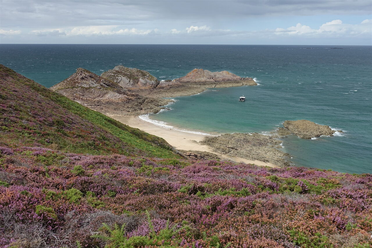 Über einen seichten Bergrücken erreichen wir die 04 Pointe des Quatre Vents (53 m) – ein faszinierender Aussichtspunkt. Durch die Ginster- und Heidelandschaft gehen wir auf einem der vielen Pfade in Richtung eines Parkplatzes. 50 m vor einem Steinhaus verlassen wir die Straße nach rechts auf einen Pfad. Wir wandern nun in Richtung eines weiteren Steinhauses. Der Pfad mündet kurz später in einen breiteren Pfad, dem wir nach halb rechts folgen. Nach 20 m gehen wir abermals halb rechts, um dann vor dem Gebäude auf dem links bergab führenden und etwas gerölligen Pfad abzusteigen – die technisch schwierigste Stelle der Wanderung.