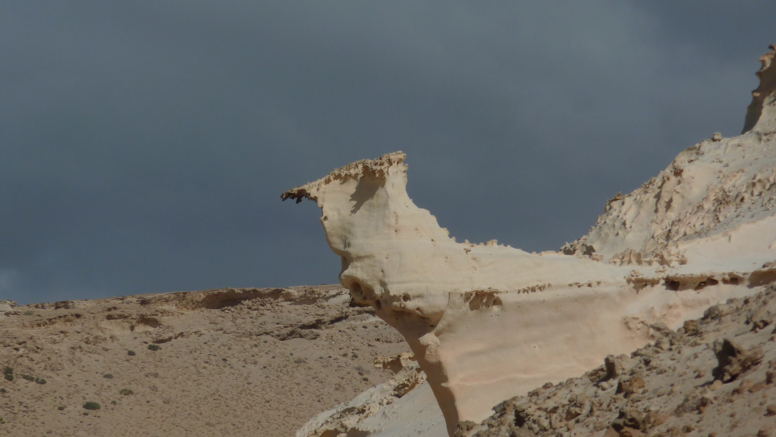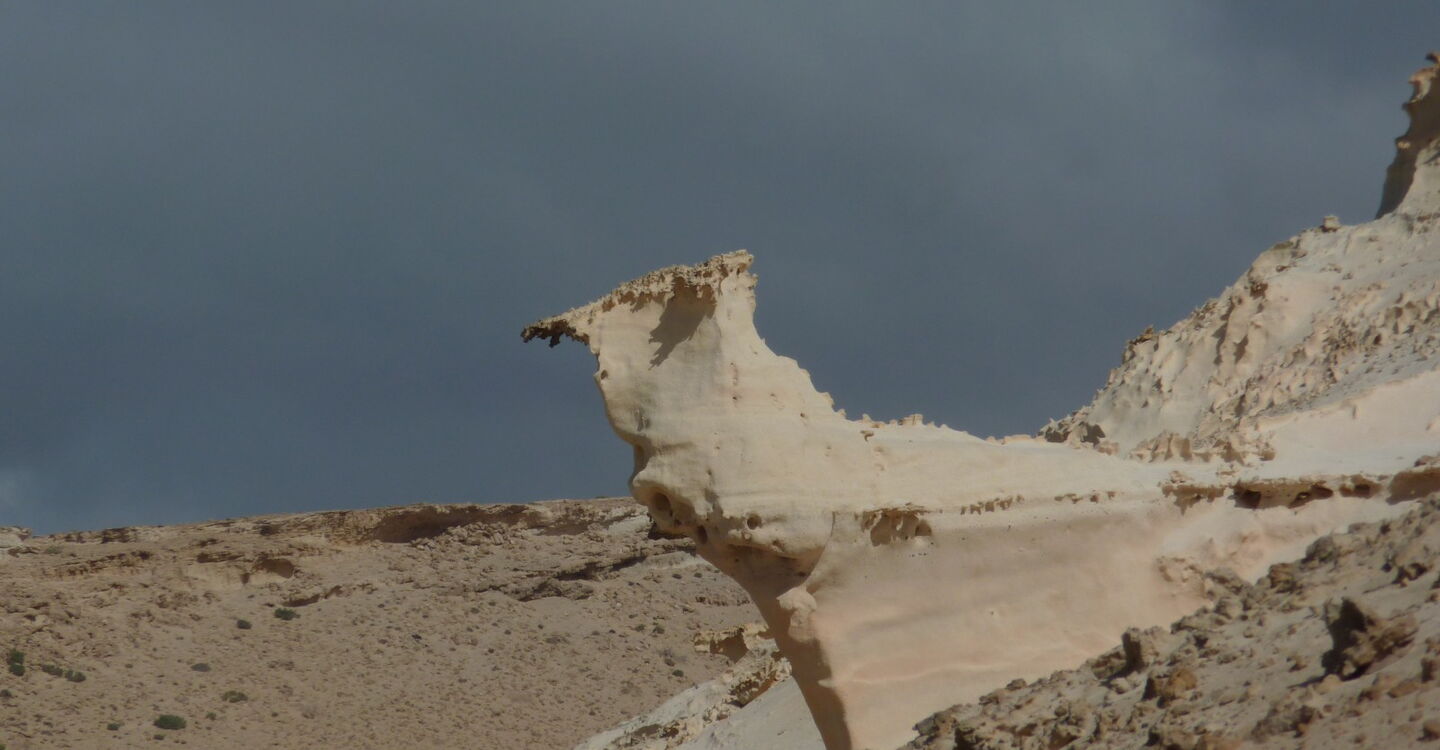 Wir treffen auf eine wilde Küstenlandschaft mit vom Wind geformten Sandsteinobjekten.