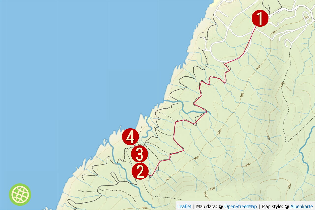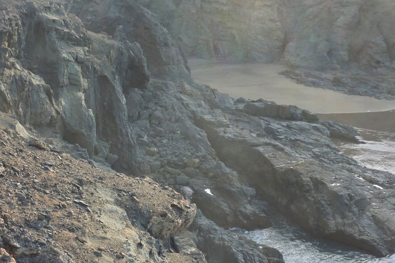 In nordwestlicher Richtung gehen wir über einen Pfad bzw. Schotterweg 300 m Richtung Meer und erreichen die Bucht, die nun direkt unter uns liegt. Über den rechts vor uns liegenden Bergrücken kann man bei Ebbe bis fast an den freigegebenen Strand gelangen. Je nach Stand der Tide ist mehr oder weniger Kletterei nötig.