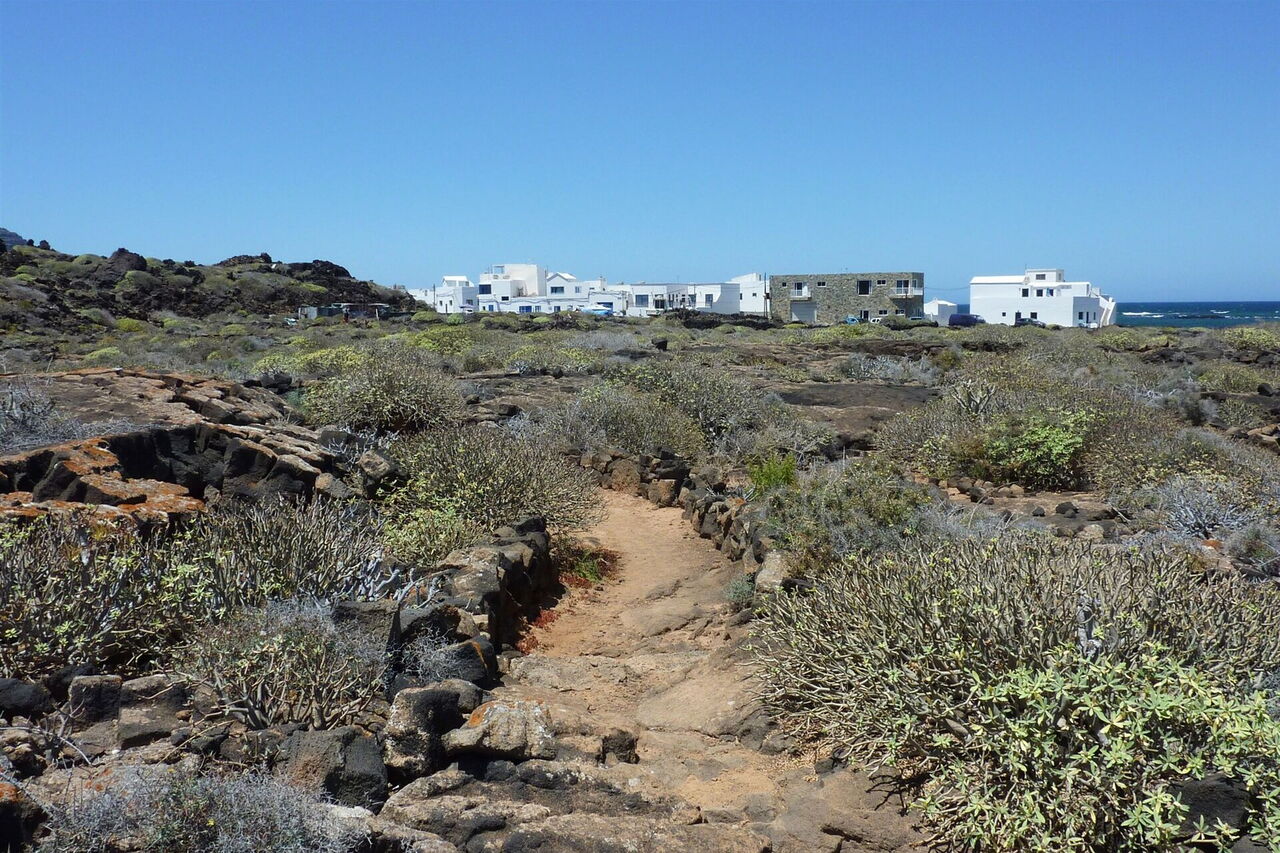 Vom 01 Start und Ziel 16 m, der Bushaltestelle in Orzola, gehen wir bis zur Hauptstraße vor und folgen dieser rechts in Richtung Hafen. Wir passieren einen Supermarkt, bis wir nach 250 m die Hauptstraße nach rechts verlassen. Auf der Asphaltstraße geht es vorbei an einer Bootslipanlage und alten Wasserauffangbecken bis zum Ende der Straße. Hier gehen wir scharf rechts, nun immer an der Küstenlinie entlang.