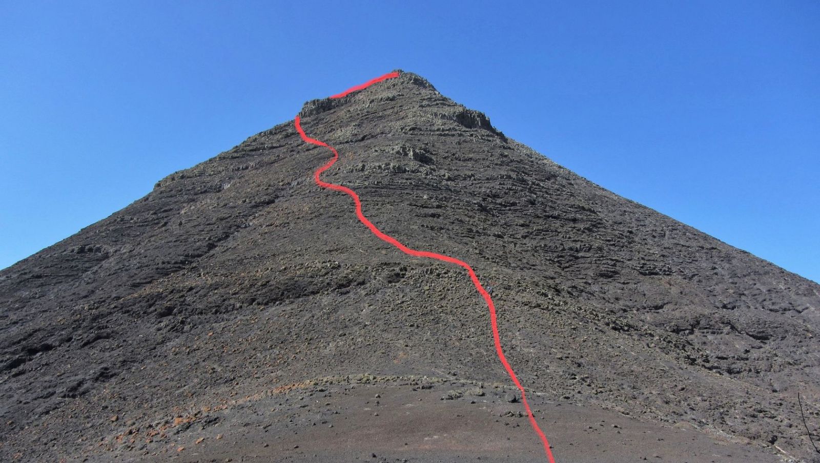 Direkt hinter dem (01) Start und Ziel (250 m), dem Mirador Degollada de Agua Oveja, erhebt sich in westliche Richtung der Pico las Pilas. Zunächst gehen wir auf dem seichten Bergrücken, bis wir am Fuße der Pyramide angekommen sind. Da das Gelände sehr steil und rutschig ist, lässt es sich in einem der vielen Barrancos besser aufsteigen.