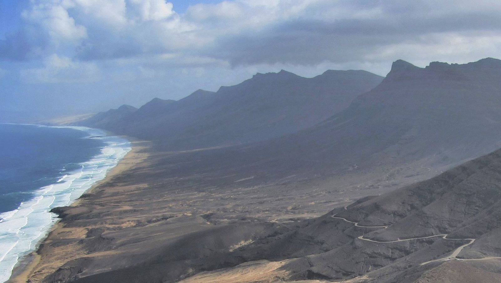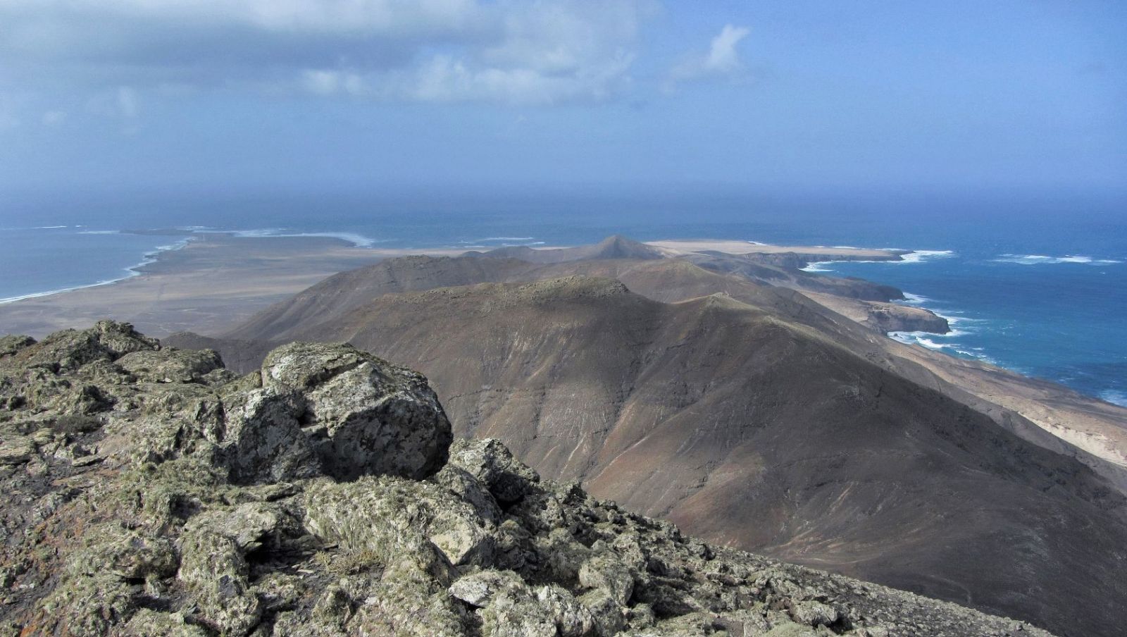 Im oberen Bereich treffen wir auf einige Felsstufen, die wir umlaufen müssen, um den Gipfel des (03) Pico las Pilas (470 m) zu erreichen. Vom Gipfel ergibt sich eine atemberaubende 360°-Rundsicht. Richtung Westen blickt man über den Südzipfel des Eilands, während man Richtung Osten direkt in die steile Flanke des Jandia-Bergmassivs hineinschaut. Der 14 km lange Sandstrand rundet das Naturschauspiel ab.