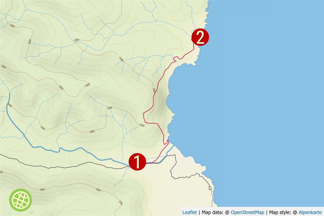 Das Auto ist geparkt und wir gehen weiter Richtung Meer. Dort angekommen, führt links ein klar erkennbarer Pfad auf die vor uns liegende Anhöhe. Nach 1,25 km ist der höchste Punkt mit 150 Höhenmetern erreicht. Es ergeben sich spektakuläre Blicke von der Steilküste bis tief ins Meer herunter. Von nun an geht es wieder bergab auf einem weiterhin gut erkennbaren Pfad. Nachdem wir eine weitere kleine Anhöhe hinter uns gelassen haben, steigen wir in das Barranco Guincho herunter und gehen nun rechts die restlichen Meter bis zu dem kleinen Strandabschnitt. Zurück zum Ausgangspunkt nehmen wir den gleichen Weg.