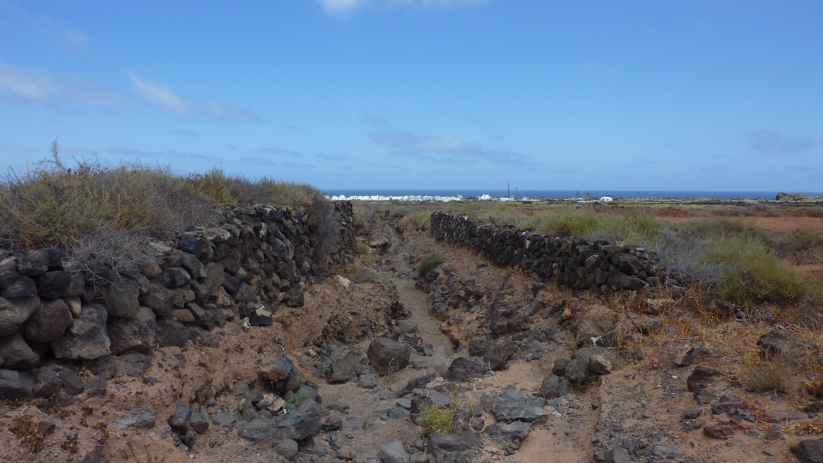Wir sehen in 150 m Entfernung einen markanten Felsen, an dem wir links vorbeilaufen, um auf der folgenden Schotterpiste rechts zu gehen. Nach 50 m, bei einer Kreuzung, treffen wir auf die Reste eines (05) alten Handelsweges (48 m). Hier gehen wir links und erreichen nach 1,1 km Orzola und das verchromte Metallgeländer.
