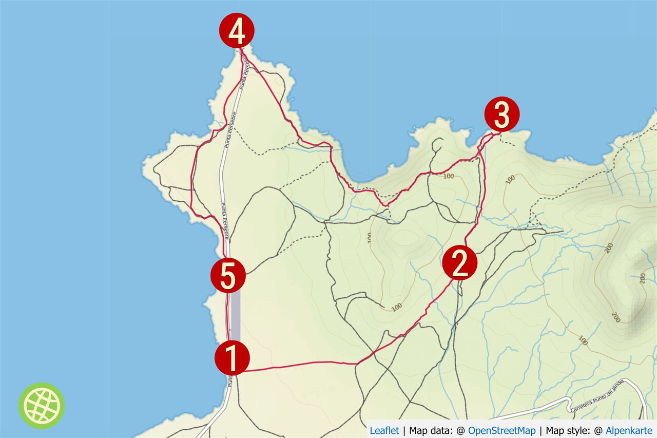 Diese Wanderung für Entdecker hat ihren Ausgangspunkt im Nichts, auf einer weiten kargen Ebene. Sie führt uns entlang des südlichsten Vulkans von Fuerteventura zu einem kleinen Tamariskenwald. Bei der nachfolgenden Bucht, der Caleta de la Madera, blickt man entlang der bizarren Felsküste. Vorbei führt der Wanderweg am kleinsten Leuchtturm von Europa bei der Punta Pesebre bis zum Ausgangspunkt, dem Playa de Ojos. Bereits auf der Pkw-Rückfahrt sollte man auf jeden Fall in dem kleinen Fischerdorf Puerto de la Cruz in der Bar Tenderete einkehren. Der vom Wirt frisch gefangene Fisch wird in einem riesigen Topf serviert. Als Beilagen werden Zwiebeln, Gofio und Weißbrot gereicht. Hier gibt es die beste und ursprünglichste Fischsuppe von Fuerteventura.