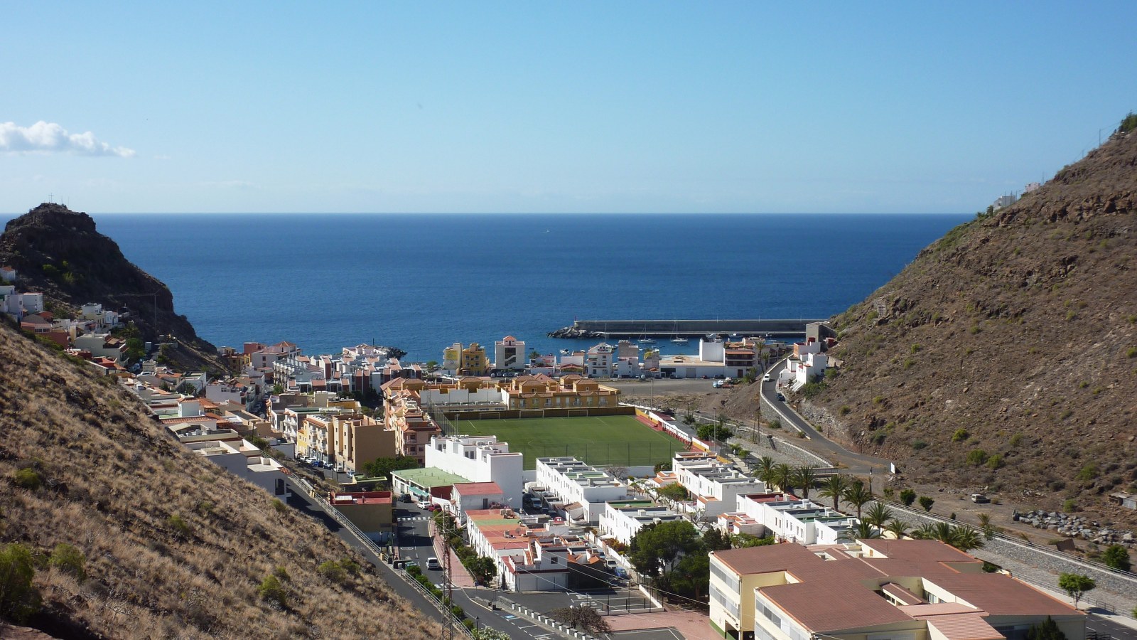 Bei vereinzelten Häusern erreichen wir erneut eine Asphaltstraße, die oberhalb eines weiteren Staudamms verläuft. In der folgenden Rechtskurve der Straße gehen wir halb links auf den beginnenden Camino, Richtung Playa de Santiago. Wir gehen ein kurzes Stück auf der GM-3, bis wir auf Höhe der Start- und Landebahn sind, um hier links vor einem grünen Maschendrahtzaun auf einen Camino zu wechseln und auf diesem bis zum (05) Mirador de La Trinchera (150 m) zu wandern. Es folgt der finale Abstieg zum Ausgangspunkt.