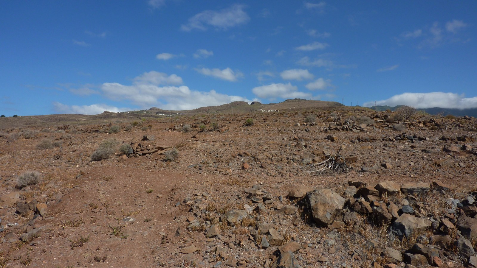 In gemütlichen langen Kehren gewinnen wir kontinuierlich an Höhe. Sobald wir Palmen erreichen - die Piste macht an dieser Stelle eine scharfe Rechtskurve -, folgen wir dem Camino Richtung Targa. Wir treffen auf den (03) Roque de los Moros (742 m). Von Süden ist die Besteigung nicht einfach. Daher gehen wir weitere 70 m unterhalb des eingezäunten Grundstücks und folgen an der folgenden Wegkreuzung dem Abzweiger nach rechts, Richtung Targa. Nach weiteren 70 m entlang einer 5 m hohen Felswand verlassen wir den Camino nach rechts, steigen über die Terrassenfelder weglos auf und erreichen eine Asphaltstraße, die zu dem Grundstück geführt, welches wir gerade umlaufen hatten. An der Asphaltstraße gehen wir links, bis sie endet. Dort gehen wir rechts direkt auf den Roque zu, der von dieser Seite einfach zu erklimmen ist.