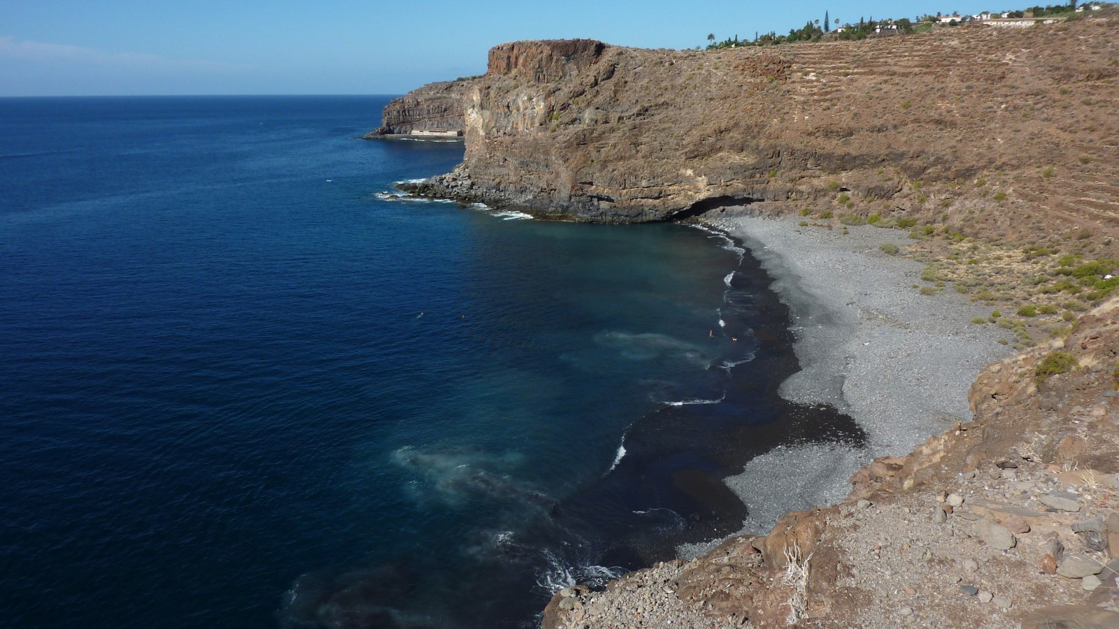 Wir queren Terrassenfelder und steigen dabei - immer entlang der Klippen - auf die vor uns liegende Anhöhe. Ein Steinmännchen rechts des Weges ignorieren wir. Es ergeben sich atemberaubende Tiefblicke zum (04) Playa del Guincho (5 m). Am höchsten Punkt gehen wir weitere 150 m taleinwärts, bis der Hang nicht mehr so steil in das Barranco abfällt. An dieser Stelle beginnen wir den weglosen Abstieg zum Strand. Der 150 m lange und 30 m breite Strand mit einigen sandigen Stellen und dem markanten Roque del Guincho lädt zum Verweilen und Baden ein. Wir steigen wieder aus dem Tal auf und orientieren uns gleich rechts an einer Ruine, die wir in 250 m Entfernung sehen. Den dahinter liegenden Felsen umlaufen wir leicht in westliche Richtung, um dann weiter in nördliche Richtung zu gehen. Wir orientieren uns zunächst an einem Strommast und im weiteren Verlauf an einem großen Felsen.