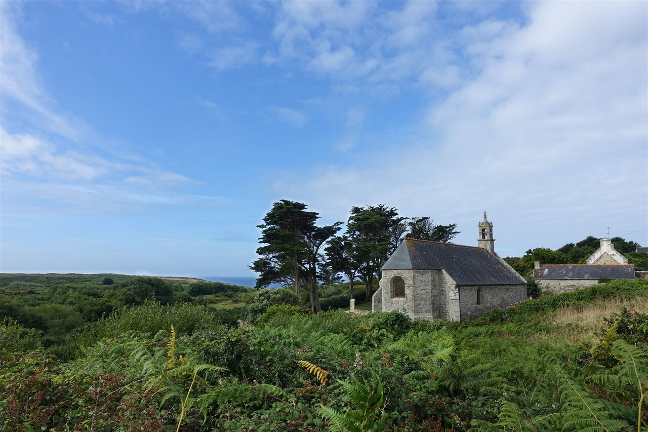 Auf der darauffolgenden Straße gehen wir 100 m links, um dann rechts in die Straße einzubiegen. Am Ende der Straße halten wir uns halb rechts, es geht weiter auf einem schmalen Pfad entlang einer gelben Hausmauer. 50 m vor der 02 Chapelle St. Michel (55 m) zweigen wir nach links auf einen betonierten Pfad ab. Wir bleiben auf dem Hauptweg, bis wir 40 m vor einem Steinhaus links auf die Straße abbiegen. Am Ende der Straße gehen wir rechts an der hohen Mauer entlang. Hinter dem steinernen Kreuz gehen wir links und dort, wo die Straße endet, setzen wir unseren Weg nach rechts fort. Schließlich gehen wir nicht links Richtung Kerhuan, sondern rechts bis zu einer Anhöhe bei einem Felsen.