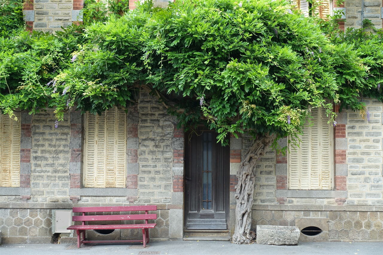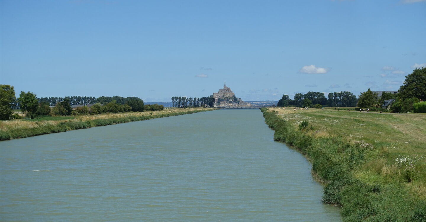 Bei dem ersten Kreisverkehr mit dem Springbrunnen gehen wir fortan auf der rechten Uferseite des Flusslaufes des Couesnon, auch ausgeschildert Richtung Le Mont-Saint-Michel. Es geht durch einen angelegten Garten mit exotischen Bäumen und vorbei an prachtvollen Villen. Die Wegführung ist immer eindeutig. Im weiteren Verlauf unterqueren wir die Bundesstraße und gelangen zur 02 ersten Brücke (1 m). In der Ferne kann man bereits die Kirchturmspitze der Abtei sehen.