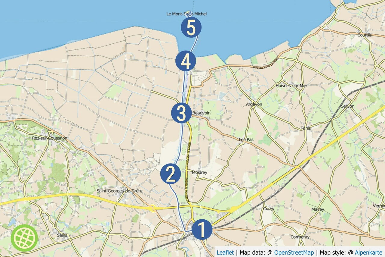 Bei einem Spaziergang durch die mittelalterlichen Gassen taucht man tief in die Geschichte und Architektur dieses klösterlichen Bauwerks ein. Äußerst beeindruckend ist das Spiel der Gezeiten. Am Mont-Saint-Michel gibt es die höchste Tide des europäischen Kontinents mit bis zu 13 m Unterschied zwischen Ebbe und Flut. Nur bei Flut ist die Gezeiteninsel völlig vom Wasser umgeben. Für den Rückweg geht man gut 200 m auf der Brücke, um dann nicht den kostenlosen Bus zum Besucherparkplatz zu nehmen, sondern mit dem Linienbus 1 zum Bahnhof Pontorson zurückzufahren. Die 05 Bushaltestelle (7 m) ist nicht markiert, daher die Angabe "200 m entfernt". Nach 15 Minuten Fahrt ist man wieder am Ausgangspunkt.