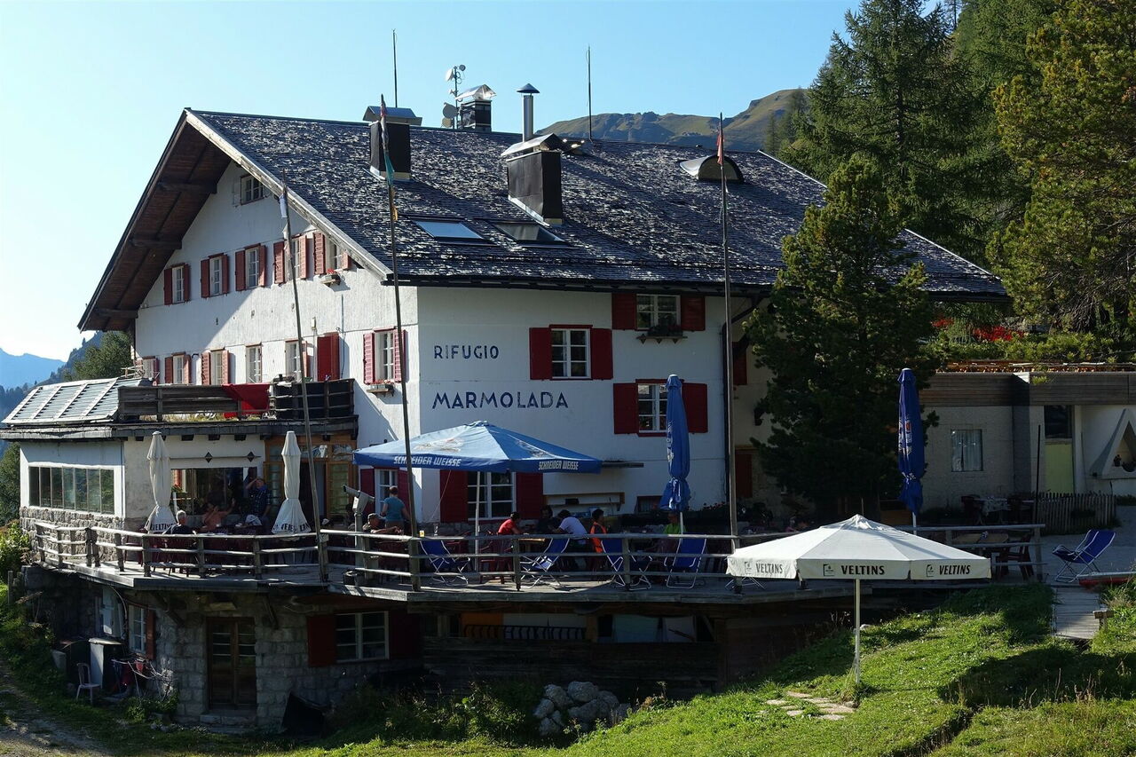 Nach einigen Metern führt uns der Weg an einer kleinen Kapelle vorbei. Wir unterqueren den Belvedere-Sessellift, überqueren Skipisten, sehen rechts oberhalb das Rifugio Sass Becè und erreichen das aussichtsreiche 02 Rifugio Baita Fredarola (2.370 m). Von hier aus gehen wir gerade auf die Marmolata zu und ignorieren den halb links abzweigenden Wanderweg.