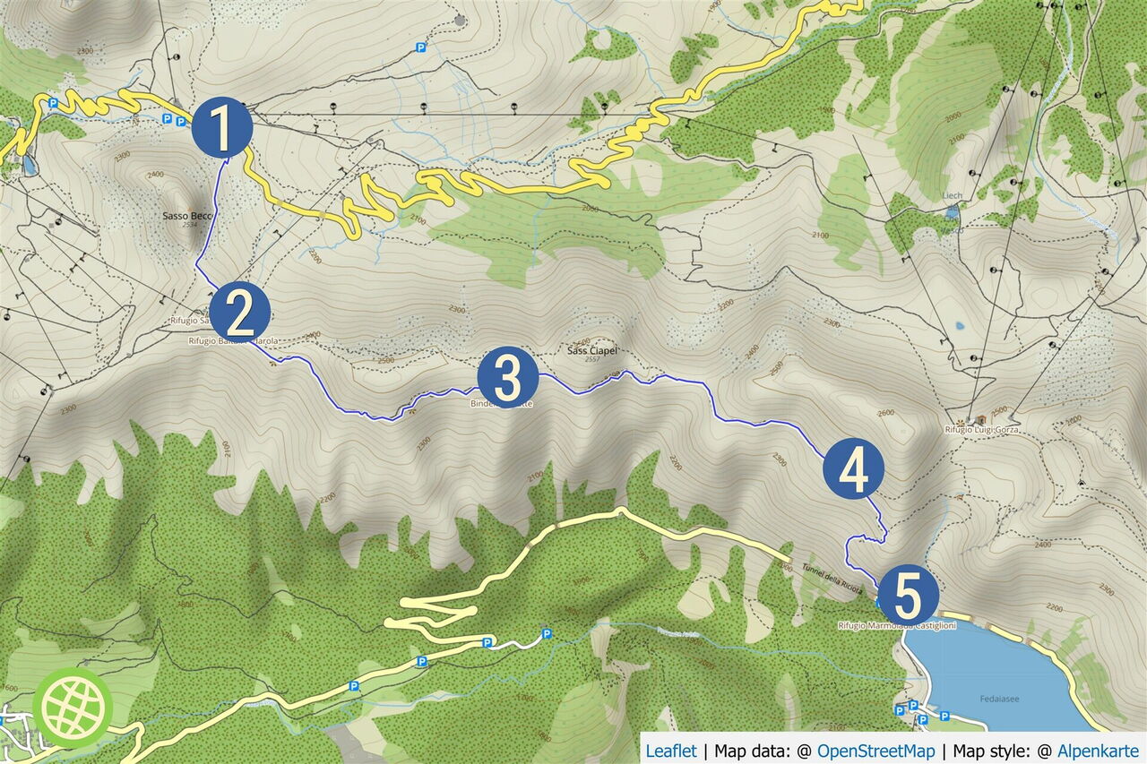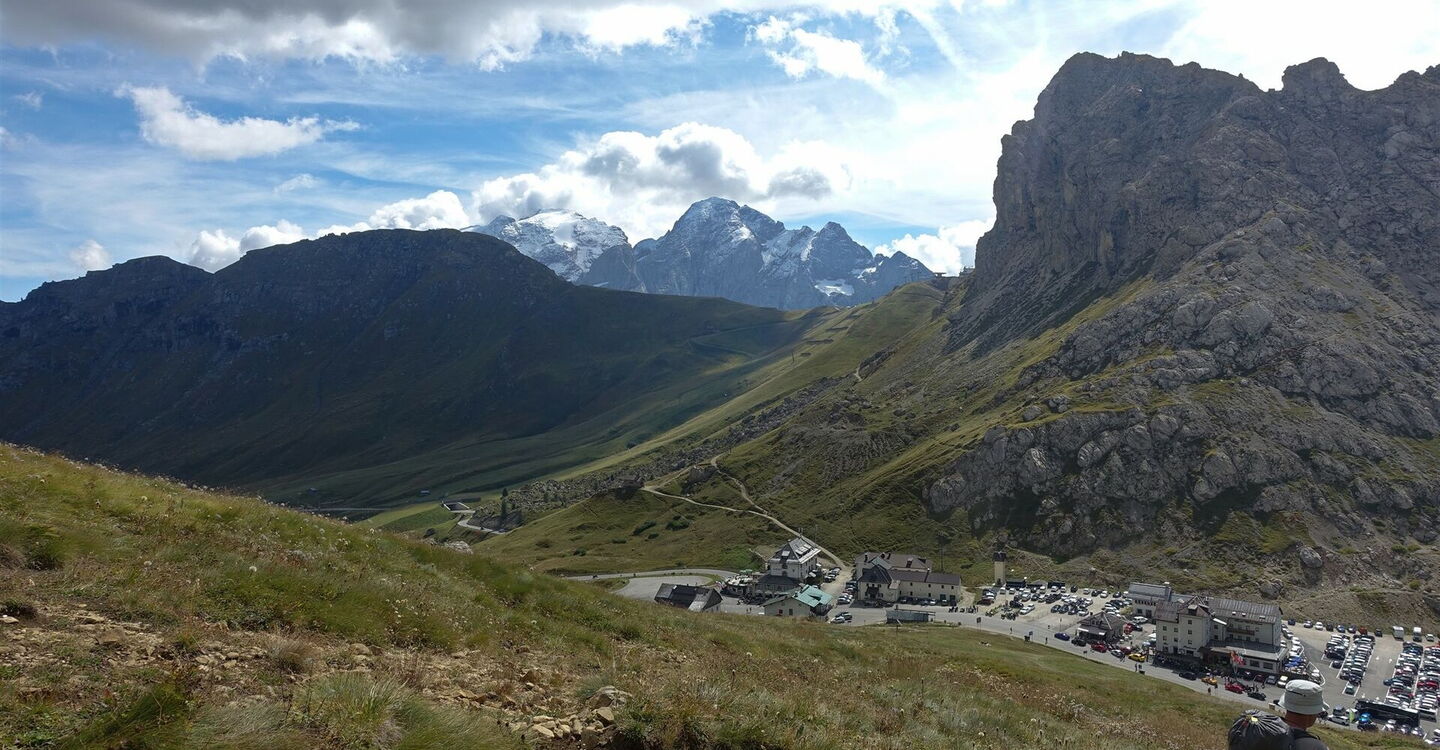 Heute heißt es entspannen und die prachtvolle Aussicht auf die Marmolata genießen. Wir wandern auf dem sogenannten Bindelweg vom Pordoijoch zum Lago Fedaia. Dieser war schon in der Vergangenheit ein wichtiger Verbindungsweg und wurde von Mehlhändlern aus der Provinz Belluno genutzt. Dadurch war es möglich, regen Handel zu betreiben. Mehl wurde gegen handgefertigte Produkte aus der Provinz Trentino getauscht. Auch erhielt die Hütte am Wegpunkt 03 den Namen Weg des Brotes, d. h. übersetzt ins Italienische Viel dal Pan. Wiederentdeckt wurde der Weg von dem Deutschen Dr. Karl Bindel, deswegen heißt er auch Bindelweg.