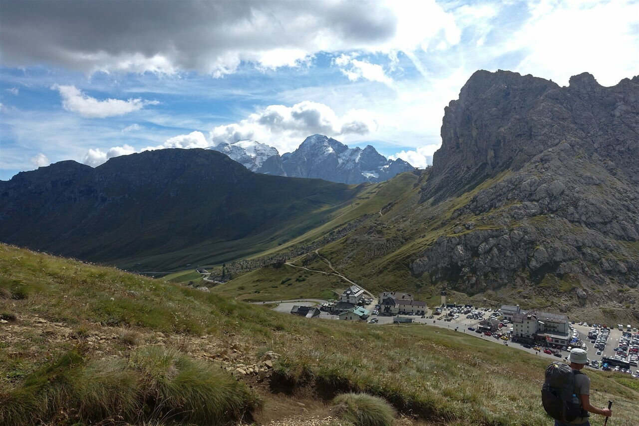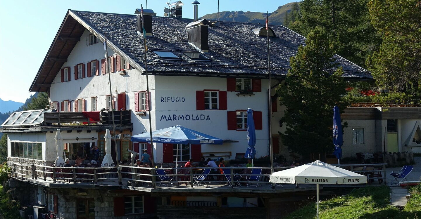 Es folgt ein aussichtsreicher Höhenweg mit faszinierender Fernsicht auf das Bergmassiv der Marmolata. Auf halber Strecke der heutigen Etappe erreichen wir die nächste Hütte, das 03 Rifugio Viél dal Pan (2.432 m).