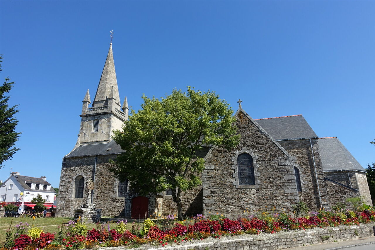 Vom Parkplatz gehen wir an der aus dem 15. Jahrhundert stammenden 01 Église St-Gervais-St-Protais Saint-Avé (45 m) vorbei und bis zum großen Kreisverkehr vor. Auf Höhe des Wasserbrunnens befindet sich auf der gegenüberliegenden Straßenseite das aus dem 15. Jahrhundert stammende Manoir du Kreisker. An der rechten Ecke des Gebäudes steht ein runder Turm, der einen Taubenschlag beherbergt. Außerdem findet man im Vorgarten einen Brunnen vor. Im 15. und 16. Jahrhundert hatten mehr als 40 Adelsfamilien in den Herrenhäusern und Schlössern im Umkreis von Saint-Avé gewohnt. Wir setzen unseren Weg auf der Rue du Général de Gaulle fort und kommen an dem Zwillingskreuz Bourg d'en Bas Croix géminées vorbei. Dies ist eine Besonderheit, denn in der Bretagne gibt es nur wenige Zwillingskreuze, dieses stammt aus dem 16. Jahrhundert und besteht aus Granit.