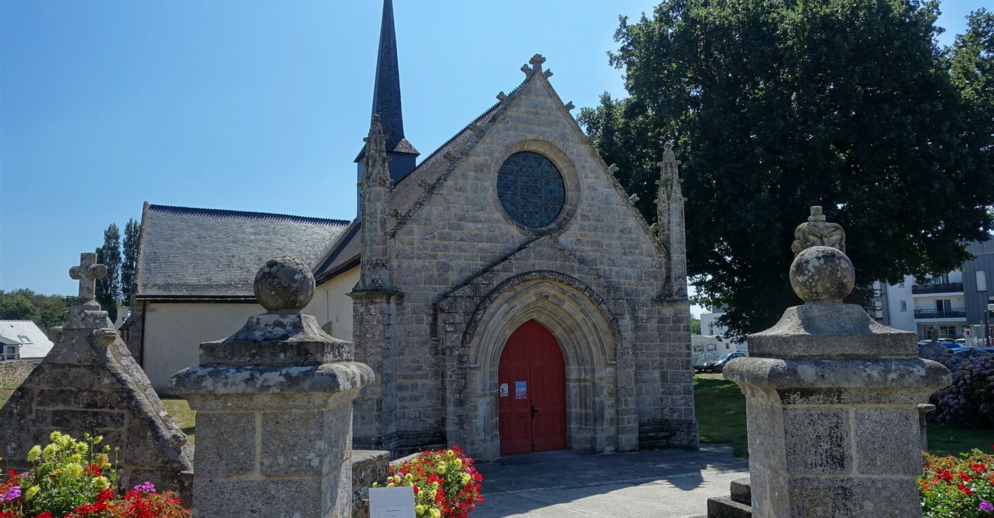 Nach vielen prachtvollen Villen erreichen wir die 1494 fertiggestellte 02 Chapelle Notre Dame du Loc (33 m). Die Kapelle ist ein schönes Beispiel für die extravagante gotische Architektur. Im Inneren befindet sich ein Chorkreuz aus mehrfarbigem Holz, eine äußerst seltene Arbeit. Der Kalvarienberg zeigt die Kreuzigung auf der einen Seite und eine Madonna mit Kind auf der anderen Seite. Wir gehen über den großen Parkplatz rechts neben der Kirche und an dessen Ende folgen wir dem Pfad, der zum etwas unterhalb liegenden Kreisverkehr führt. Auf der rechten Seite, direkt vor dem Kreisverkehr, biegen wir rechts auf einen Pfad ab und folgen dem Bach Lihuanteu durch ein Feuchtgebiet.