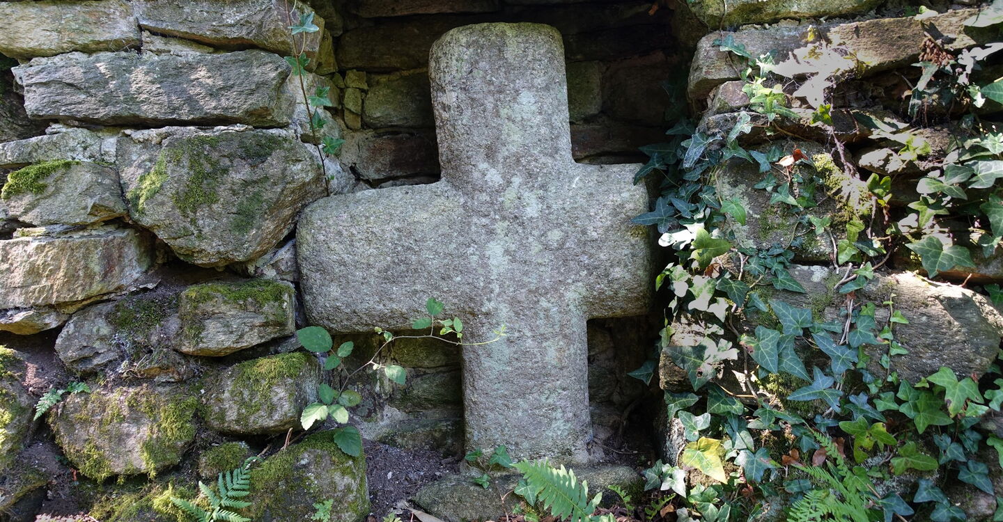 Nachdem wir durch eine Linkskurve gegangen sind, erreichen wir die ehemalige Mühle von Lesnevé, sie beherbergt heute Ferienwohnungen. Direkt hinter deren Parkplatz verlässt ein Pfad die Straße nach links. Dieser führt entlang der langen Mauer des Château de Beauregard Saint-Avé, das man von keiner Position aus sehen kann. Es wurde im 18. und 19. Jahrhundert erbaut, an der Stelle, wo zuvor ein altes Herrenhaus aus dem 15. Jahrhundert stand. Historisch ist das Gebäude interessant, denn am 14. Februar 1800 war es Ort der Unterzeichnung der Friedensverträge der Bretagne. Nach einem wunderschönen Hohlweg gelangen wir an eine Weggabelung, an der wir halb rechts gehen, bevor wir kurz später wieder auf die Straße treffen, an der wir links gehen. Die Straße endet an der Hauptstraße, an der wir rechts auf dem Pfad 333 m weitergehen, um hinter einem Holztor die Straße zu queren und auf einen weiteren schönen Hohlweg zu gelangen. Wir erreichen die Quelle beim 04 Croix de Fontenon (67 m).