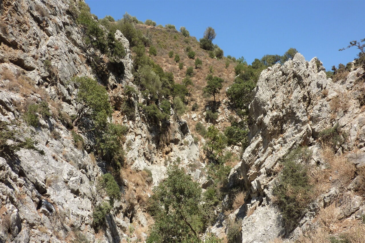 Hier gehen wir links und im weiteren Verlauf erreichen wir hinter der Unterführung den kleinen Dorfplatz von Kerasia. Dort biegen wir bei der Taverne halb rechts in die kleine Gasse ein. Auf der asphaltierten Straße gehen wir geradeaus weiter, um bei der nächsten Weggabelung links zu gehen. Wir gelangen auf die Felder, bei der darauffolgenden Weggabelung gehen wir links und nach 100 m durch die Rechtskehre vorbei an 2 Häusern, bis wir die 04 Schlucht Agios Antonios (292 m) erreichen. Hier gehen wir noch durch das Trockenflussbett und auf das links stehende Gebäude zu. Hinter diesem beginnt eine Piste bergauf, die im weiteren Verlauf durch drei Ziegengatter führt.