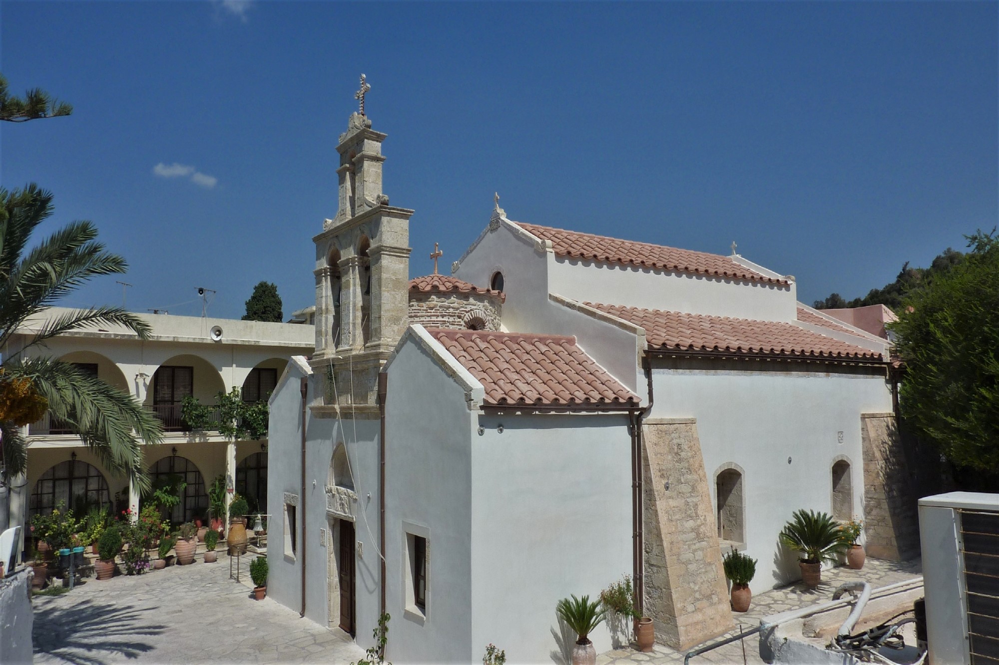 Nach 300 m, vor einem runden Wassertank, kürzen wir abermals über die Piste nach rechts ab. Weitere 280 m gehen wir durch die Talsohle und biegen bei der großen Kiefer links ab, gehen sofort wieder rechts und nun für 800 m leicht bergauf, bis unsere Piste in eine weitere mündet. Kurz später mündet von links eine Piste in unserer Hauptpiste. Wir kommen an einer kleinen Kirche vorbei und erreichen den Parkplatz des 03 Paliani Convent (339 m), das älteste Nonnenkloster auf Kreta. Nach der Besichtigung gehen wir auf der Hauptstraße weiter und sehen im Tal rechts die Ruinen des Tempels Oktarsissa. Ein lohnenswerter Abstecher. Es geht nun weiter bergab bis auf die Höhe einer riesigen Platane – in 50 m Entfernung befindet sich ein Brunnen. Hier gehen wir links hoch und bis zur Hauptstraße vor, um dort 300 m rechts bis zur Kreuzung vorzugehen.