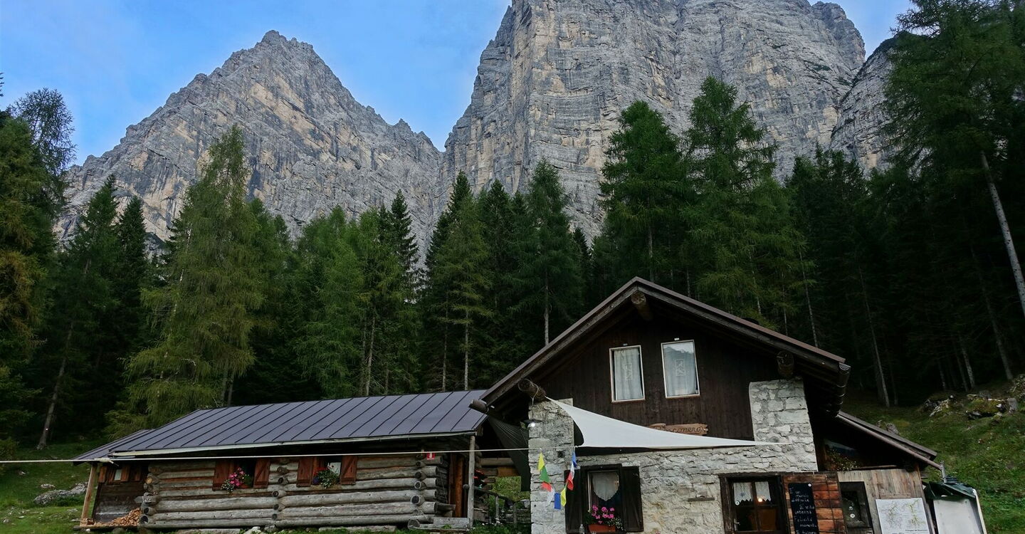 Wir gehen in nordöstlicher Richtung um das 01 Rifugio Bosconero (1.457 m) herum, um dann in östlicher Richtung auf dem Wanderweg 490 durch den Wald aufzusteigen. Bereits im Reich der Latschenkiefern angekommen gabelt sich der Pfad. Beide Wege sind zielführend und verlaufen unterhalb der extrem steil aufragenden Nordwand des 2.404 m hohen Rocchetta Alta. Kurz vor der Scharte führen beide Pfadspuren wieder zusammen. Dort quert auch der Wanderweg 482 und wir beginnen mit dem steilen Aufstieg durch ein nicht enden wollendes Geröllfeld.