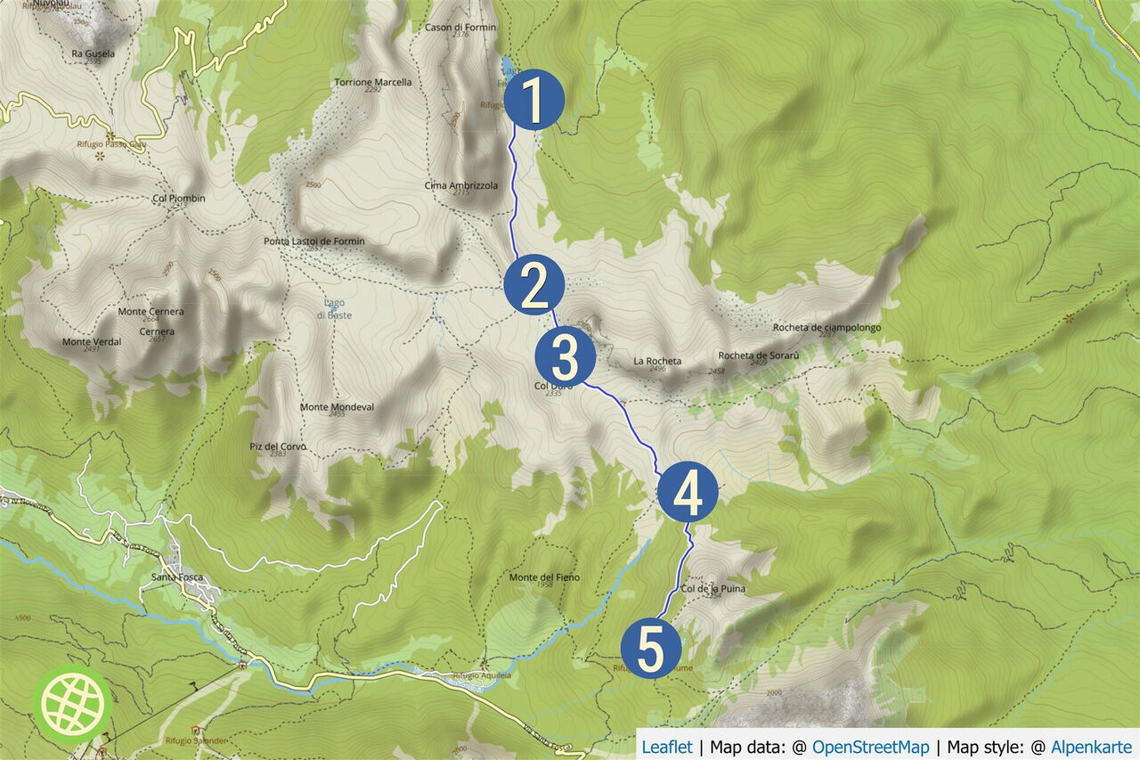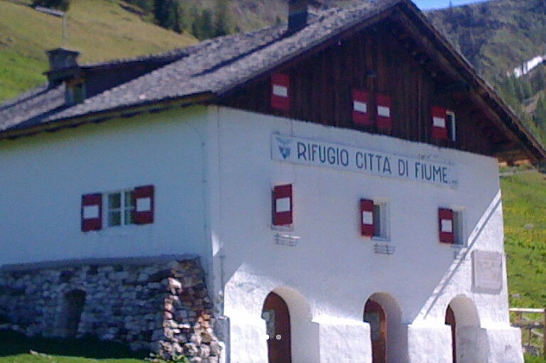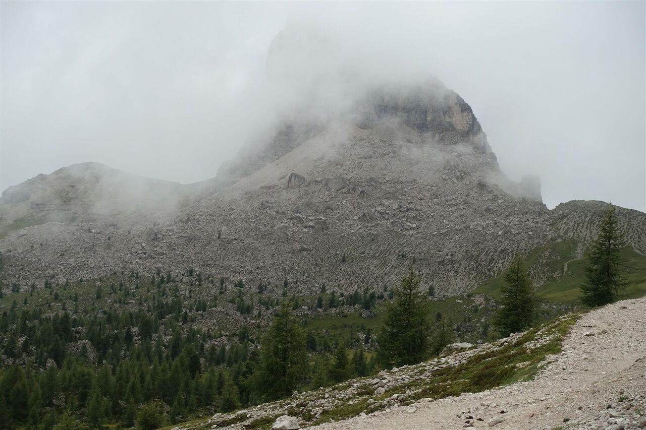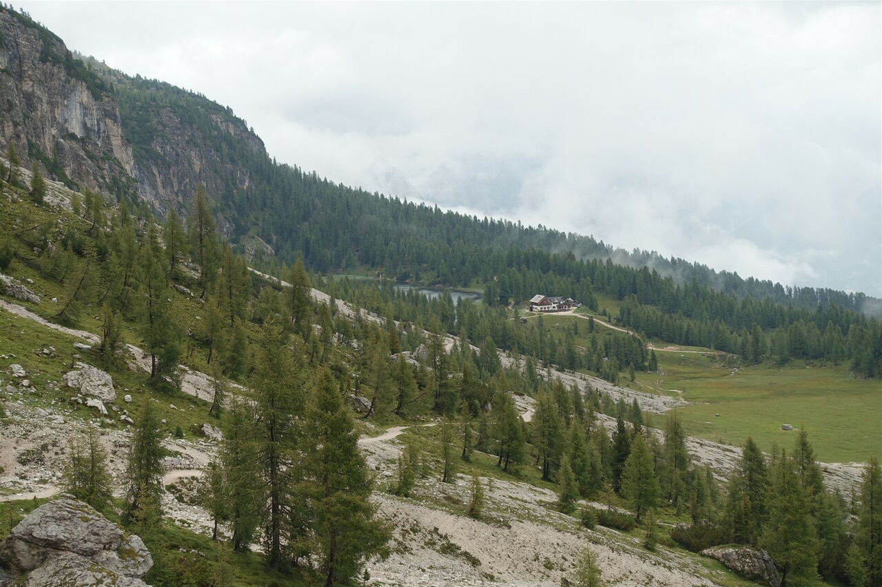 Durch den lichten Wald – unterhalb der Westhänge des Berges Col de la Puina – wandern wir auf der Forststraße leicht bergab. Sobald wir unterhalb der Forststraße das 05 Rifugio Città di Fiume (1.918 m) sehen, steigen wir auf dem nachfolgenden Pfad zum Haus ab. Von der Hütte blickt man direkt auf die mächtigen Schutthalden der Nordwestflanke des 3.127 m hohen Monte Pelmo.