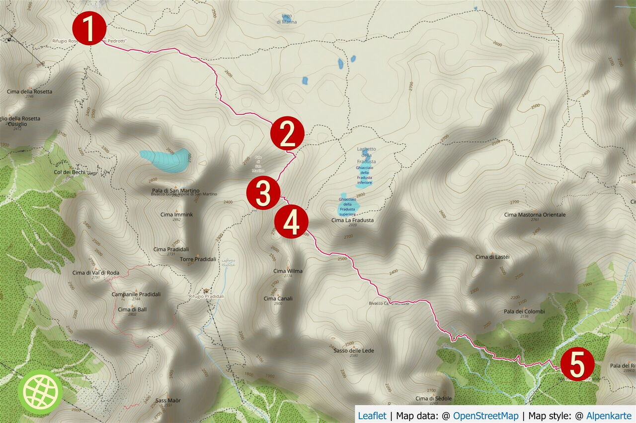 Startpunkt/Abbruch/Einstieg: Das Rifugio di Rosetta ist mit der Seilbahn und zu Fuß erreichbar und befindet sich am Ende der Tour 42. Endpunkt: Das Rifugio Treviso ist nur zu Fuß erreichbar und befindet sich am Anfang der Wanderung 45.