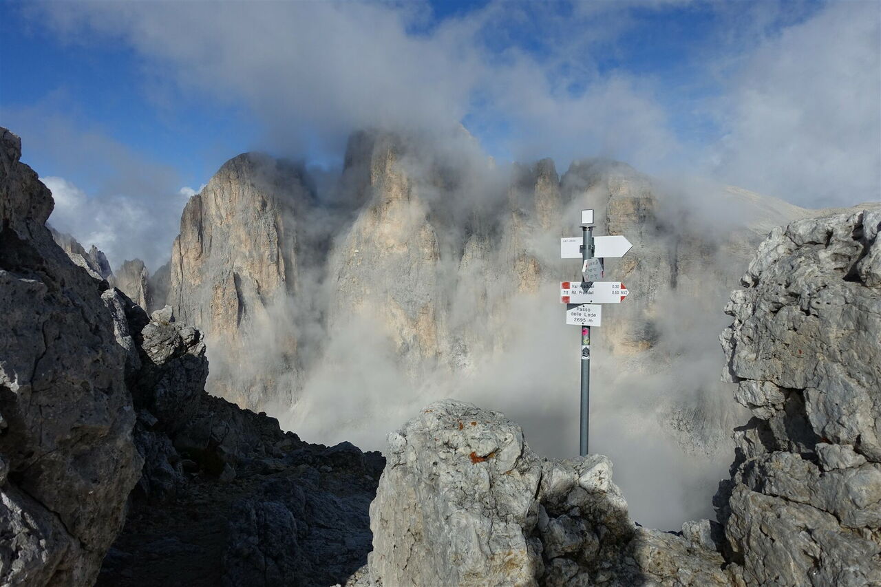 Von dem 01 Rifugio di Rosetta (2.581 m) entfernen wir uns in östliche Richtung auf dem breiten Wanderweg. Den sofort folgenden linken Abzweiger zum Rifugio Mulaz (siehe Tour 42) ignorieren wir und bei dem nachfolgenden Wegweiser folgen wir halb rechts dem abzweigenden Wanderweg 709 zum Passo di Pradidali Basso. Ein Pfad ist auf der karstigen Palahochfläche nur schwer auszumachen. Steinmännchen und weiß-rote Markierungen helfen bei der Orientierung, die bei schlechter Sicht umso schwieriger wird.