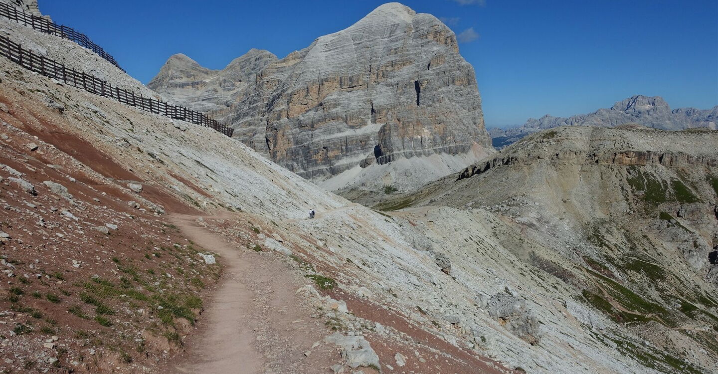 Vom 01 Rifugio Lagazuoi (2.778 m) gehen wir die wenigen Meter zur Seilbahnstation herunter und folgen dann dem mit Holzpfählen befestigten Wanderweg 20. Es geht vorbei an Stellungen aus dem Ersten Weltkrieg und weiter bis zur Forcella Lagazuoi. Bei dieser kleinen Einsattelung gehen wir wenige Meter geradeaus bergauf und folgen dann dem weiterführenden Wanderweg 20 B. Der Pfad führt in Richtung der mächtigen Westwand der Tofana di Rozes. Es geht parallel zu Metallgerüsten zur Lawinensicherung bis zum 2.507 m hohen Forcella Travenanzes.