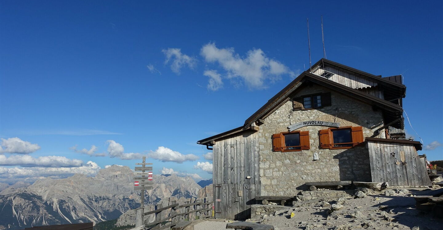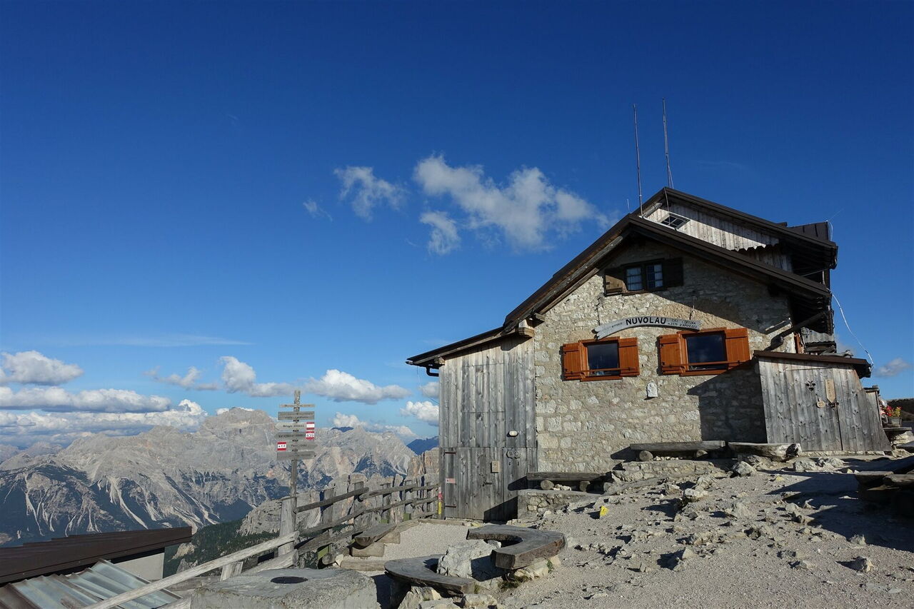 Vom 01 Rifugio Nuvolau (2.575 m) wandern wir auf dem felsigen Bergrücken auf dem Wanderweg 439 in westliche Richtung talwärts. Je weiter wir bergab steigen, umso höher erhebt sich vor uns der 2.649 m hohe Monte Averau (siehe Tour 25).