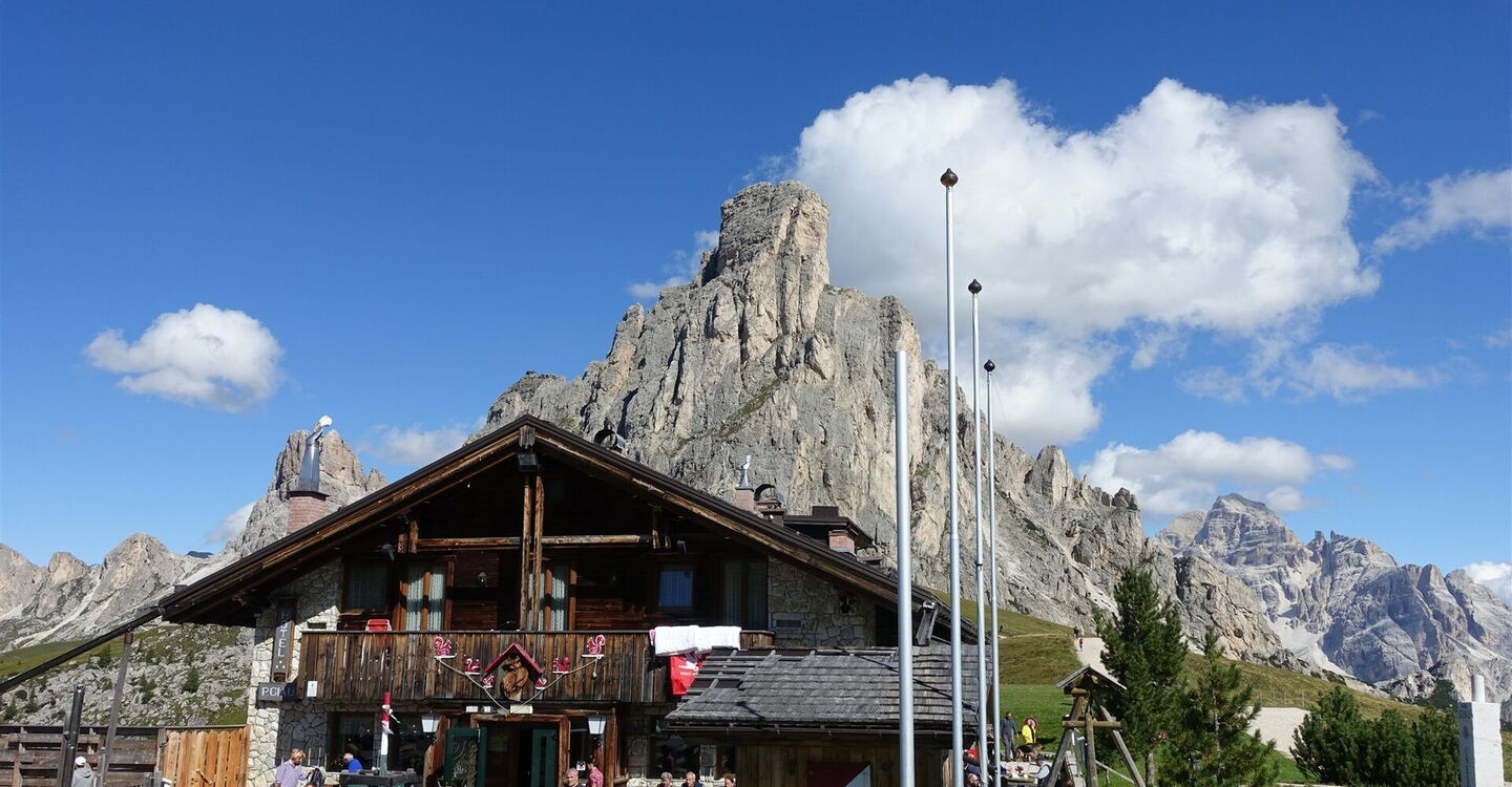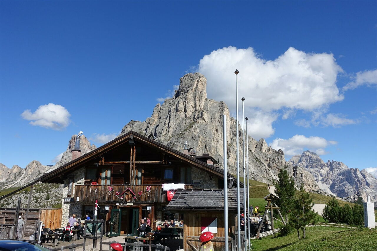 Sobald wir wieder Bergwiesen erreichen, wird der Pfad zum breiten Wanderweg. Vor einem großen Haus mündet von scharf links der Wanderweg 444 in den unsrigen. Dieser kommt vom Rifugio Cinque Torri und dem Klettersteig Via Ferrata Ra Gusela (Wanderweg 438). Auf dem breiten Wanderweg geht es bequem zum 05 Passo Giau (2.236 m) mit dem gleichnamigen Berggasthof.